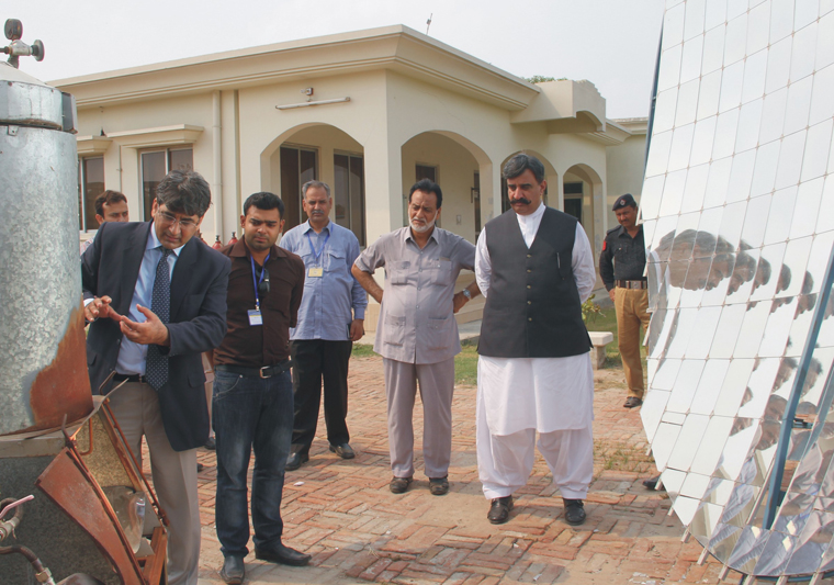 The 50 mega watt, to be generated from Quaid-e-Azam Solar Park situated in Cholistan, will be added to the national grid within six months under the first phase, said Punjab Energy Minister Sher Ali Khan. He addressed an inaugural session of three-day International Conference on Renewable Energy Technologies in Pakistan arranged by Faculty of Agri Engineering, University of Agriculture Faisalabad in collaboration with University of Kassel, Germany; US Department of Agriculture (USDA) and International Centre for Development and Decent Work (ICDD). Punjab Energy Minister Sher Ali Khan along with UAF faculty members visits Solar Boiling Unit, UAF The inaugural session was chaired by Punjab Energy Minister Sher Ali Khan whereas Prof Dr Oliver Hensel from University of Kassel, Germany; UAF Dean Prof Dr Muhammad Iqbal; Wolfgang Scheffler, Director, Solar Bruecke, Germany; Anjum Munir, DAAD Project Coordinator Pakistan; Ursula Saarbeck, Director and DAAD IC Islamabad addressed the inaugural session. The moot is meant to highlight the renewable energies that will help cater energy demand in the country. The Minister said that the Punjab government was taking all possible steps to address the prevailing energy crisis. The promotion of the alternative energy is also the part of the strategy mapped out to reduce load shedding. He was of the view that Pakistan is having installed capacity of 23,000 MW whereas 16,000 MW is being produced so far. He said the Punjab government is setting up small dams on canals consisting of 10 to 20 MW each. He added that in this regard, a big project on Tunsa barrage to produce 120 MW of energy will also be initiated soon. He was of the view that in Punjab is also mulling producing the power from the biomass. The province is having 48 sugar mills which are being encouraged to produce more electricity from sugarcane waste (*begas*) so that it can be added to national grid. Dean Prof Dr Muhammad Iqbal called for promoting alternatives energy technologies by saying that Pakistan can produce 20,000 MW only from wind energy. He was of the view that 720 million kg animal dung per day can produce 1243 MW of energy while 81 million tones of biomass can contribute significantly for energy production without harmful effects on the environment. He lauded the steps being taken on the part of Punjab government for the promotion of alternative energy. Prof Dr Oliver Hensel informed the audience about the solar energy by highlighting Pakistan is the blessed with the seasons where sun shines all the year. Especially, the farmers’ community should get the benefit from the solar energy. He said they were working on the inter-disciplinary approach by the enhanced collaboration in agriculture and food engineering sector. The same model can be applied in the UAF also. Ursula Saarbeck said that the under the project of DAAD, University of Kassel is making efforts with the different universities of the world in the area of social science and technology. Project on awarding scholarships and development of the rural areas are also included in the said joint efforts. Dr Anjum Munir said that in the present era, it is need of the hour to shift to the alternative energy technology as Pakistan is in the acutely short of fossil fuel. He said that the UAF has set biogas plant whereas work on 3.8 mw solar energy is being done. He said that UAF has started Energy System Engineering degree keeping in view, the importance of energy sector in the country. The minster flanked by UAF Vice Chancellor Prof Dr Iqrar Ahmad Khan also visited the biogas plant, solar energy units installed at UAF and inspected other ongoing research projects.