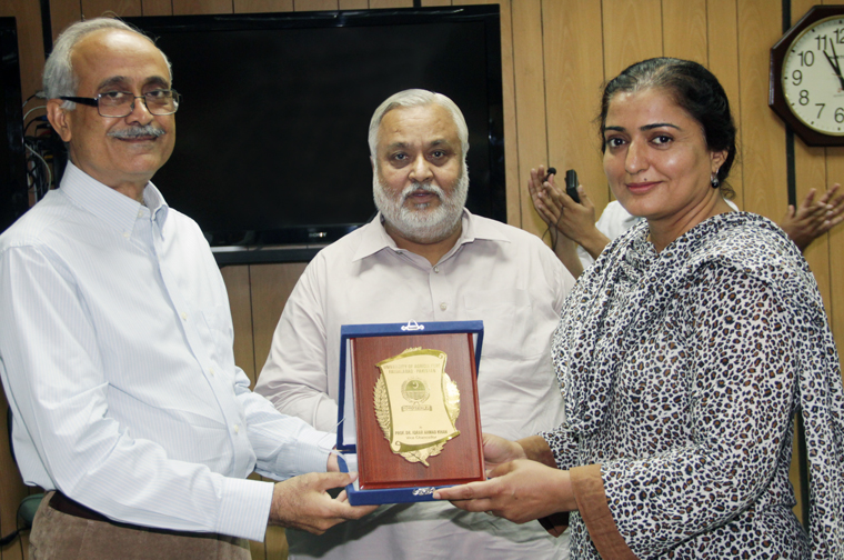 World population will touch nine billion by 2050 which demands expedited efforts on the part of agricultural scientists to ensure food security, said University of Agriculture Faisalabad (UAF) Vice Chancellor Prof Dr Iqrar Ahmad Khan. He chaired the concluding session of worship titled “Molecular techniques for breeding horticulture and agronomics crops” arranged by Institute of Horticultural Sciences and Office of Research, Innovation, and Commercialization (ORIC), UAF at Video Conference Room. Dr Sumaira Riaz from UC Davis was the chief guest. IHS Director Prof Dr Aslam Pervez; ORIC Director Dr Rao Asif, Dr Jaffar Jaskani and Dr Ahmad Sattar also spoke on the occasion. University of Agriculture Faisalabad (UAF) Vice Chancellor Prof Dr Iqrar Ahmad Khan presents souvenir to Dr Sumaira Riaz from UC Davis The Vice Chancellor said that molecular techniques are the fast moving area on which agricultural experts in Pakistan should also concentrate. The country is blessed with four seasons, he said, adding that there is many potential in cultivating new crops rather than focusing only on traditional ones. He said that valuable researches in the field of agriculture are being produced. But, it is a real challenge to transfer the knowledge into goods and services that will help in increasing per acre production. Keeping in view, the UAF has expedited its outreach programme. Under the US Department of Agriculture (USDA) programme, famers of Pakistan and Afghanistan are being trained about the techniques to increase productively, he said, adding that UAF is also partner in the said USDA project. Dr Sumaira Riaz urged the scientists to pace up their research work. He also asked the students to play their due in the challenges of food security. Hardworking and motivation are the key to progress, she said adding that abundant opportunities are available that will open up new avenue of prosperity. Prof Dr Aslam Pervez said that it was the need of the hour to inform the farming community about the ways to increase productivity. It will bring prosperity and help in poverty alleviation. Prof Dr Rao Asif stressed the need to produce quality researches. Dr Jaffar Jaskani and Dr Ahmad Sattar briefed the audience about the work being done on mango, citrus, apple and other fruits.