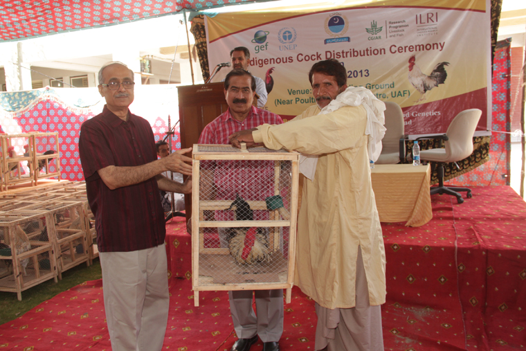 A large number of indigenous uniquely adapted breeds have become extinct for the last so many years and further 32% are at risk of become extinct at fast track due to crossbreeding with and/or replacement by exotic breeds in programs designed to improve animal productivity coupled with neglect arising from shifts in social settings, production systems and/or market demand of certain animal products. The concerns expressed by UAF VC Prof. Dr. Iqrar Ahmad Khan while addressing the participants of indigenous chicken distribution ceremony organized by Department of Animal Breeding & Genetics under a joint program of UNEP, GEF, ILRI and UAF to conduct research on development and application of decision support tools to conserve and sustainably use genetic diversity in indigenous livestock & wild relatives here on Friday morning. Dr. Iqrar Khan emphasized to conserve the indigenous chicken as like organic food, many people were ready to prefer and pay for indigenous eggs and chicken meat. He underscored the need to revive the rural poultry that would help alleviate poverty and unemployment in the rural settings of the country. Dr. Khan expressed his dismay over the disappearance of indigenous poultry, and hoped that under the project, distribution of indigenous chicken amongst rural poor families would pave a way to sustain and revive the rural poultry that will regain its past glory shortly. He praised the provision of 5.7 million $ by the donors to execute the project by four institutions i.e. University of Agriculture Faisalabad, Bangladesh Agricultural University, University of Peradeniya Sri Lanka, and National Institute of Animal Husbandry, Veitnam to secure and improve livelihoods of poor livestock keepers through utilization and conservation of indigenous Farm Animals and Genetic Resources. Addressing the gathering, National Coordinator of the project and Chairman Department of Animal Breeding & Genetics Prof. Dr. Sajjad Khan gave briefing about the objectives, target species, expected outputs of the project. He told that from Hasilpur and Faisalabad, three villages from each district had been selected by random sampling and later from each village, 50 households were earmarked to give them a set of 4 hens and one cock with a condition to keep the parents and return back the first batch of offspring’s so that other needy families may also get benefit and cascade effects may alleviate poverty. He said the project will enable to have an assessment of diversity; market and policy analysis, and identification of future policies with their impact. He revealed that his department is going to introduced to new breeds of chicken.