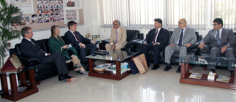 Ambassador of EU Delegation Mr. Lars-Gunnar Wigemark & Canadian High Commissioner Greg Giokas visited UAF and had a meeting with Vice Chancellor UAF Prof. Dr. Iqrar Ahmad Khan along with Deans and Directors of the varsity at New Syndicate Hall here on Friday. Mr. Lars-Gunnar Wigemark while addressing the meeting stressed the need for joint collaborative efforts among various countries through a consortium in order to cope with food security future challenges. He said that EU was providing assistance to Pakistan in the field of Horticulture particularly branding of Multan “Mango” and Sargodha “Kinnow” in order to shift the financial benefits to the farming community at large. He added that UNIDO had been striving for reduction of post harvest losses and development of value addition mechanism in agricultural sector of Pakistan. EU High Commissioner was of the view that Universities had been playing a significant role for the transformation of knowledge in order to revolutionized development sectors. He lauded the educational & research standard of UAF which had placed this institution at Top 300 best Agricultural Institutions of the World. He said that University had great potential to fetch more opportunities in EU student exchange program and research funding on competitive grounds. He also hoped that by the inititiation of 3-Year Post-Graduate Diploma (PGD) launched at National Institute of Food Science & Technology (NIFSAT) in collaboration with EU funded UNIDO program would pave the way towards assurance of food safety and control in the Country. High Commissioner of Canada, Mr. Greg Giokas during his address highlighted the bilateral issues and cooperation in agricultural sector and said that both countries were enjoying cordial relations since many decades. He was of the view that subsidized agricultural mechanism had been shifted in to competitive focus agricultural productivity. He urged the scientists for the brand recognition in order to yield maximum financial benefits for farming community. He said that GMO Technology had revolutionized the productivity and this is the only way which could have minimized the risks of mall nutrition around the Globe. UAF Vice Chancellor, Prof. Dr. Iqrar Ahmad Khan while briefing the Ambassadors highlighted the achievements of the University particularly vertical growth of impact which had placed it among 150 Top Ranked Universities of the World. Dr. Khan also highlighted the joint collaborative research programs initiated with the help of International Institutions and termed it the future prospect for future betterment and yield potential of agricultural and livestock produce. Both Ambassadors visited the various Research Projects and Laboratories of the University.
