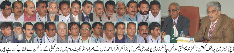 Deputy Chairman Planning Commission Dr. Nadeem-ul-Haque vowed to invest at least 10% of GDP in the research thereby to reap the benefits of development by promoting new business and employment opportunities in rural areas, arresting the energy crises, and up scaling the outreach activities with farming community, scientists, and industry people. He was addressing an extraordinary meeting of the deans committee here at new syndicate hall of the University of Agriculture Faisalabad on Monday morning. Dr. Nadeem-ul-Haque said the research was linchpin of technological and social development of the country and deserves due importance in the national policy making. He said universities are the agent of change and need to create a real research culture so that scientists and students jell together their heads and come up with innovative solutions confronting the humanity. He said in 1892, the University of Chicago evolved with only 36 million dollars and made a tremendous progress in a short span of time owing to research endeavors that resulted in winning as much as noble prizes by its scientists. He expressed his dismay on the growing budget deficit and other governess issues hampering the development of the country adding that during the last five years, the country suffered badly due to bad governess, crushing the merit and pursing an agenda of vested interest in all spheres of life. Dr. Nadeem Ul Haque while lauding the bio energy project of the university, asked the management to immediately submit a PC-I so that the same could be up scaled at rural level that could save more than 400 billion rupees annual spending on fuel and electricity to run the 12 million Agri tube-wells and meet the domestic energy needs. He underscored the need of encouraging new questions and making brain storming sessions so that the young minds think upon the issues and their solutions. He urged the university management to create a network of research and provide such an environment to think beyond the box. He dispelled the impression of a rural Pakistan adding that we need to make an investment in rural uplift and creating business opportunities thereby to net the growing migrations and provide employment opportunities at rural level. He vowed to pull the meritorious teachers and scientists out of the BPS grade system adding that such people need to be incentivized and properly taken care off. Dr. Nadeem Ul Haque urged the University to promote domestic poultry in lines with the philosophy of organic foods to make tangible arrangements of poverty alleviation. Earlier, UAF VC Prof. Dr. Iqrar Ahmad Khan while briefing the visiting guest said they were planning to making at least 50 percent curriculum on line. Dr. Iqrar A Khan thanked the deputy chairman planning commission for providing generous support for its Sub Campus at Toba Tek Singh. Dr. Khan apprised the deputy chairman about the admission mechanism, outreach activities, internationalization and other activities of the university in providing financial support to about 3500 students. He said six faculties were offering diversify schemes of studies make the university a comprehensive institute of the country adding that during the last four years, first degree programs have been increased to 26, Masters 40 and students have been offering 35 PhD programs. He said we at UAF are pursing a research culture religiously adding that Planning Commission is providing funds for executing six research projects under International Food Policy Research Institute program of the commission. Later, the deputy chairman planning commission visited post harvest lab, Monsanto field of genetically modified corn, poultry research center and bio energy project of the university.