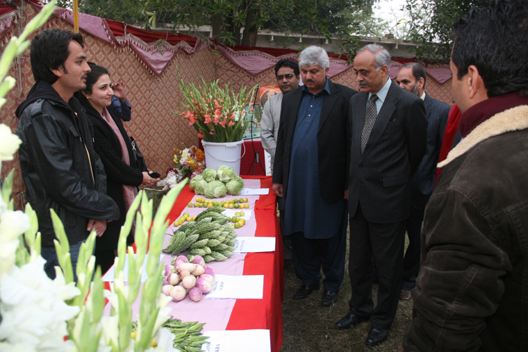 Two-day Winter Flower Show- 2012 ended at UAF with Vice Chancellor Prof. Dr. Iqrar Ahmad Khan chief guest of the concluding ceremony. During the exhibition, students from UAF, Lab Schools, ARRI, NIAB and NIBGE participated with their flowers stalls. The chrysanthemums, whose origin is traced back to ancient China, are on display in full glory at flower show. The show was organized by Institute of Horticultural Sciences, UAF. The stalls were divided into some categories depending upon the nature and philosophy of of the organizers. The participating organizations include UAF, Lab Schools, Ayub Agriculture Research Institute, NIAB, Sitara Chemicals, and NIBGE. The flowers, arranged on either side of a green plot of Faculty of Agriculture attracted a large number of visitors. Addressing the gathering UAF VC Prof. Dr. Iqrar Ahmad Khan described the floriculture and landscaping an emerging business in the world and urged the students to enrich their hands on training to equip them with the latest trends of the business. A judging panel gave points to the flower displays of each participating organization based on the number of flowers in a pot, the visual aesthetics of the display, the quality of the flowers and diversity of flowers in a single display. According to results, in Group 1, NIAB stood 1st followed by AARI. In Group II, Autumn flowers, Indoor/house plants, varieties of cactus and succulents won by NIAB, and AARI respectively. Sitara Chemicals won the double chrysanthemum, 24 extra ordinary plants chrysanthemum, and maximum variety of potted chrysanthemum within an area of 5 x 10’. The amateurs and individual competitions of basket of flowers won by Waleed, Liaba Matloob, M. Shoaib Shah and Kaneez Fatima. 24 Potted plants of chrysanthemum of different varieties won by Ahmad and Asad, Aman Zehra, Mehak, Aysha Shahid and Aysha Khalid. Division C was won by Junior Lab School. The competition of flower arrangement was won by Urfa, Faria Azhar, and M. Imran. Presenting the fresh flowers in reflection of spiritualism, tolerance, and hanging arrangements were won by Rashid Iqbal, Kanza syed, and Waleed, Razia Irshad, Syed Inamaullah, Saman Chaughtai, Mehwish Ikram, Shaza, and Kanza Syed respectively. Nurseries Display was named to Waleed followed by Naeem BSc 7th Semester. Special Display on table was won by J.K Agri. Farms, Inam Ullah, and Ali Hasan whereas special display on ground was won by Furukh & Shahbaz, Amjad Nawaz and Waleed respectively. Day care centre was given special prize. The Chief Guest, distributed prizes among the winners of the exhibition and termed the show a crowed puller in the cold days of winter. Dean, Faculty of Agriculture Prof. Dr. M. Arshad and Director Institute of Horticultural Science, Prof. Dr. M. Amjad also spoke on the occasion.