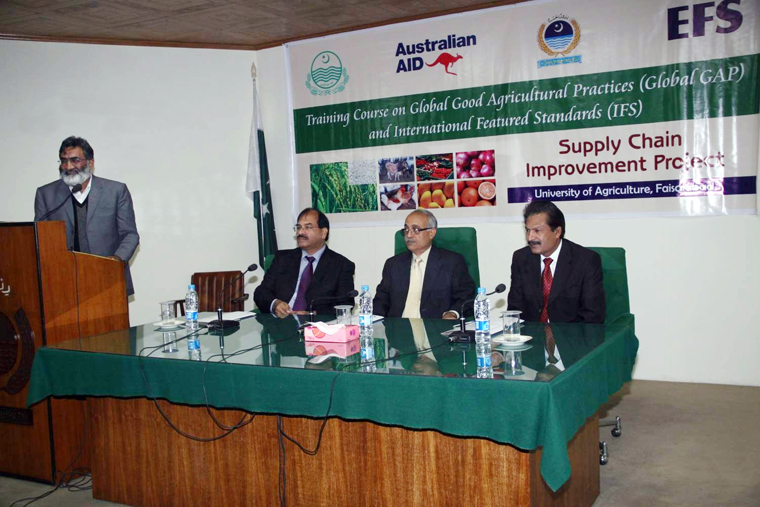Exports of Agricultural and Livestock products from Pakistan have exhibited an increasing trend in current years but these are much less than the actual potential and are confined to conventional wholesale markets. Their share in the fast growing high price end super markets is meager. This was stated by Prof. Dr. Iqrar Ahmad Khan, Vice Chancellor University of Agriculture, Faisalabad while addressing the inaugural session of 5-Day Training course on “Global Good Agricultural Practices (GAP) and International Featured Standards (IFS)” regarding supply chain management jointly organized by Endowment Fund secretariat (EFS) and AUS Aid on Monday at New Senate Hall. Dr. Khan said that The close proximity of import markets in the Middle East, Iran and Afghanistan, and market access to Malaysia, offers enormous potential for the export of agricultural and livestock products from Pakistan. He added that we can exploit our export potential by adopting International standards in befitting manners. He lauded the efforts of Government of the Punjab to launch a project titled “Supply Chains Improvement of Selected Agriculture & Livestock Products”. He maintained that this project will support and facilitate the development of supply chains that conform to the international requirements for food safety and traceability leading ultimately to increased exports of agricultural and livestock products from the country. Dr. Iqrar Ahmad Khan stressed the need for more diversified Agronomic and market strategies to grab more markets for our value added goods in spite of export of cotton and rice raw materials. Prof. Dr. Muhammad Arshad, Dean Faculty of Agriculture said that University has won the bid to provide R & D services as well as capacity building to ensure the implementation of Global GAP and EFS. Mr. Tariq Qamar, International Auditor said that for food producers today, there is a constant challenge to grow safe, healthy products in a responsible way. He added that new pressures from consumers, retailers and legislation have placed new demands on farmers and growers. He maintained that they are increasingly required to use production techniques that reduce the impact of farming on the environment (land and sea), to reduce their use of chemicals, and to make efficient use of natural resources, while safeguarding the welfare of both workers, farm animals and sea life. He was of the view that being able to show a commitment to good agricultural/fish farming practices with GLOBALGAP has become essential for accessing the market. Prof. Dr. Aman Ullah Malik conducted the program and told that during this first spell of 5-Day training the participants from various faculties would be equipped the basic tools of Global GAP and later on in another spell capacity building on EFS issues would be occurred.