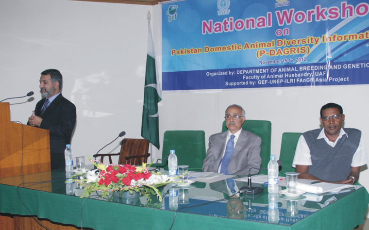 Pakistan was blessed with rich Indigenous Farm Animal Resource (FAnGR) which could be exploited for enhancement of productivity keeping in view the emerging food security challenges , this was stated by the speakers at 3-day workshop on Country Based Indigenous Domestic Animal Genetic Resource Information System ( DAGRIS) for Pakistan organized by the Department of Animal Breeding and Genetics , University of Agriculture, Faisalabad in collaboration with GEF-UNEP-ILRI FAnGR Asia Project on Thursday at New Senate Hall of the University. Prof Dr. I qrar Ahmad Khan Vice Chancellor UAF was the chief guest while Dr.Tadelle Dessie Alemayehu, Expert from International Livestock Institute,( ILRI) Nairobi ( Kenya) was the guest of honour , Prof. Dr. Muhammad Sarwar ,Dean, Faculty of Animal Husbandry and National Project Director, Prof. Dr. spoke on the occasion . Dr. I qrar A Khan said that world has become a global village and people were being benefited with each other experiences in order to cope with future challenges. He urged the scientists to join hands to minimize the threats of food insecurity to the population of the world by utilizing all resources. Prof Dr. I qrar Ahmad Khan said that Collated information on the extent and use of existing diversity in indigenous Farm Animal Genetic Resource was the basis for their present and future sustainable utilization and conservation. He added that such information was generally incomplete in developing countries like Pakistan, Bangladesh, Sri Lanka and Vietnam, otherwise rich in genetic diversity of indigenous FAnGR. He was of the view that Research Institutes in these countries were needed to develop and maintain systematic Information systems in order to support improved utilization and breeding improvement. Dr. Tadelle Dessie Alemayehu said that African counties were beein obtained animal breeding resources from America and Europe but Pakistani Genetic resource could me more suitable for them. He added that ILRI had been developing DAGRIS as web-based electronic source of information on selected indigenous animals which could be exploited for food security as well. Dr. Muhammad Sarwar said that this project was initiated in three continents and four countries with diversified features. Dr. M Sajjad Khan said that durin this 3-day workshop people from all Provinces of the country woul be benifitted with each other experiences and final recommendations would be presented in closing ceremony.