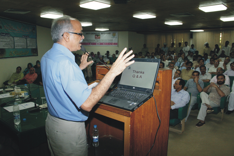 University of Agriculture Faisalabad and Punjab Medical College are going to jointly host an international event on September 24, 2012 to explore new ways and means for regulating the insect activity as eradicating the dengue mosquito would be against the biological balance of the nature, said UAF Vice Chancellor Prof. Dr. Iqrar Ahmad Khan while addressing the participants of Dengue seminar here in new senate hall of the University on Sunday morning. He told that in early 2011, when the dengue outbreak started, the Punjab Government was looking for trained professionals to control the dengue epidemic, at that time of catastrophic UAF took the lead and provided galvanized manpower to guide the government properly. He urged the participants that to avoid the dengue virus, we need to discharge our collective responsibility by making all out efforts in this regards. Dr. Iqrar Ahmad Khan said UAF is not complacent and actively playing its role in all times of need, and now invigorating to make the campus a role model in all respect of humanity as it houses hundreds of intellectuals and fertile minds. Dr. Iqrar Ahmad Khan emphasized the need to excel in research and development activities to explore the other preventive aspects in this regard. He told that globally, more than 100 million people had been affected by Dengue during the last one decade adding that in Brazil hundred percent population of some towns has been affected by dengue virus. He Vice Chancellor told that besides R&D activities, UAF hold scores of dengue awareness seminars, arranged walks, distributed pamphlets, revitalized the Faisalabad Research Forum, and acted promptly in surveillance activities of the city government. He lauded the Punjab Government in timely addressing the Dengue epidemic, thus, the number of dengue patients are reduced this year. Dr. Iqrar Ahmad Khan congratulated the Entomology Department and Career Development Center for arranging an excellent seminar on the topic. Addressing the participants as keynote speaker, Prof. Dr. Anjum Sohail told that albopictus and Aedes mosquitocausing the dengue virus were not harmful but after biting a virus carrier person who came from overseas, the virus was transmitted to other people adding that government should make the quarantine department more vigilant to control such disease. He said that a dengue virus decreases the immunity system of the human body and a patient of other diseases can carry the virus more rapidly. He urged the gathering to remain changing the water in pots and not allow stagnant water for more than a week to prevent the larva growth. He emphasized that fogging and spray should be need-based as an excessive use of spray and fogging would make the mosquito more resistant on one hand, and by killing the mosquito, disrupting the natural biological balance on other hand. Dr. Anjum Sohail dispelled a common myth that the mosquito of that kind can transmit a dengue virus adding that only female mosquito bites the human and make a person carrier of the dengue virus. Program Officer of Career Development Center Govt. of the Punjab Miss Aneela Javed , Dr. Rashid Rasul Khan, and CDO Ms Asifa Naz also spoke on the occasion. On the occasion, students of Laboratory School System also presented interesting activities on the topic. An exhibition to create awareness about the dengue was also held by the Entomology, Microbiology, and Biotechnology departments of the University.