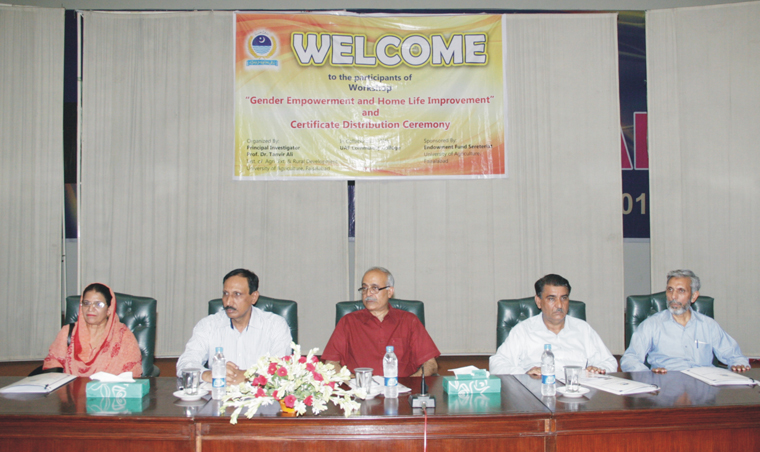 Speakers of the workshop on “gender empowerment and home life improvement” underscored the need for changing mindset which creates hurdles in recognizing and bringing the women in mainstream of the society. The workshop organized by Institute of Agri. Extension & Rural Development in association with UAF community college at Iqbal Auditorium on Saturday morning. Addressing the participants as chief guest, UAF VC Prof. Dr. Iqrar Ahmad Khan emphasized the need of changing mindset which limits women recognition and acceptance in the society. He urged the organizers to extend their scope of work and get an impact assessment of the participating families as such initiatives need to effect tangible benefits to the family, society and country at large. He told that Aurat Foundation is undertaking a variety of programs like training, skill development projects, participatory social development, and Gender Equity programs worth 45 million dollars and University would like to become its partner by offering capacity building, skill development and outreach programs as UAF is a proud member of NEVTEC, ICDD, AusAid, USDA, USAID, IFPRI, TIKA, and Punjab Government’s skill development programs. He revealed that UAF is going to hold skill development programs at AJK saying that there is a tremendous potential of raising the cottage industry of branding the Achaar which can grab a huge global market worth billion of US dollars. Dr. Iqrar A Khan expressed his dismay over non-existence of any recipient organization from Pakistan winning 64 projects of Bill & Melinda Gates Foundation to address the gynecological issues around the world. Dr. Khan urged the academia of the Inst of Agri. Extension and Rural Development to launch such programs of community participation and skill development which can ultimately transform into tangible benefits to the society. Dean Faculty of Social Sciences Prof. Dr. M. Iqbal Zafar urged the participating females to equip themselves with such skills helping them in economic generation. He said that some students of the faculty are working on impact assessment of the project. Earlier, delivering welcome address, Dr. Tanvir Ali Director Inst. of Agri. Extension and Rural Development highlighted salient features of the project and told that UAF is a comprehensive university, and besides offering under and postgraduate degree programs, it organizes a range of on-campus and off-campus skill development programs aiming at making the participants skillful and hand on experience which enable them to engage themselves in economic generation businesses. He told that about 186 females got training at Laboratory Girls High School and as many as 787 females belonging to Chak # 260, 263, 265, 266, and 273 RB were equipped with various skills through short courses including beauty parlor, poultry farming, goat farming, livestock management, stitching, cooking, computer classes, first aid, preservation of food post-harvest practices, and better health practices etc. He said that the university’s administration interventions including induction of 135 female teachers, training of female faculty, women health centre, women complex, summer schools, evening camps and others had played a significant role in catering the needs of women at campus. He said that the university was also kicking off the transmission of FM to educate the locals as well as rural community about the latest agrarian practices. He said that radio would also provide a platform to the students about polishing and exhibiting their agricultural journalism skills. Other speakers include Dr. Saira Akhtar, Dr. Zakria Yousaf Hassan, Ms Rakhshanda Akhtar, Dr. Shaukat Ali, Miss Mahwish Munawar, Qari Muhammad Iqbal and Prof. (Rtd) Zubair Siddique and others also spoke on the occasion.