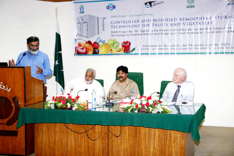 Speakers of the seminar on “Controlled and modified atmosphere storage technology for fruits and vegetables” urged the government to create forward and backward linkages as the country can earn billions of US dollars annually by exporting fresh fruits and vegetables through controlled and modified atmosphere technology meant for slowing down the respiratory system of the fruits. The technology enables the local traders to enhance profitability and send the produce through sea which costs seven times less than the air fright. The seminar arranged by Postharvest laboratory of Institute of Horticultural Sciences in collaboration with Punjab Agriculture Research Board at New Senate Hall of the University on Thursday morning. The speakers including Prof. Dr. Aslam Pervaiz, Dr. Aman Ullah Malik, Prof. Dr. Rai Niaz Ahmad, Dr. Simon Schouten, Dr. Abdul Rehman, Omer Hafeez and Dr. Ahmad Sattar Khan were of the view that only thing the country needs is an urgent attention of the government policy makers to establish storage facilities of CA technology at Balochistan, Southern Punjab and other areas where fresh fruits are been produced abundantly. Addressing the seminar as Chief Guest, Prof. Dr. Rai Niaz Ahmad Dean Faculty of Agri. Engineering & Technology told that his faculty is offering Food Engineering degree course for the next academic session which would certainly pave the way for grabbing export potentials of fruits and vegetable and bring down the post harvest losses. He emphasized the need for government patronage to establish a large number of CA storage rooms and facilities in different areas of the country. Dr. Aslam Pervaiz told that at present out of 15 billion ton fruits and vegetables, the country is exporting only 4% whereas 65 to 70 percent is being used locally. He urged the government to heavily invest on the sector to promote the exports of fresh fruits and vegetable as the whole world is found of Pakistani mango, orange, apples and other fruits due to unique taste and fragrance of the produces. Dr. Aman Ullah Malik told that for the last four years he along with his team, successfully made a tremendous effort of examining the storage behavior of various fruits and vegetables in the controlled and modified atmosphere. He said that the exporter can enhance the shelf life of the produce upto 30 to 40 days and can easily export the container through sea on very less exporting cost, which can increase his profit manifolds. He said that the main way of preserving fruits and vegetables in storage or during long distance transport is by refrigeration, and controlled atmospheres are considered a supplement to increase or enhance the effect of refrigeration. “CA storage is only successful when applied at low temperatures” he added.