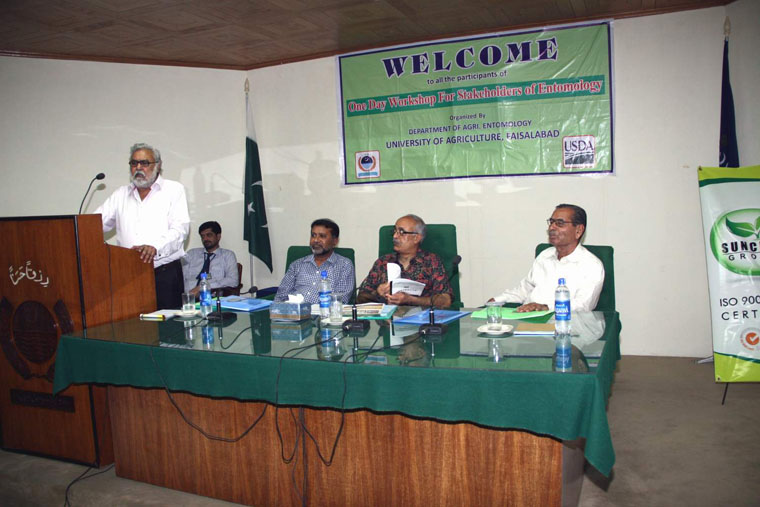 Pakistan was losing its fruits, vegetables and agricultural Global markets due to in judicious and excessive use of insecticide without observing good agricultural practices. This was stated by Prof. Dr. iqrar Ahmad Khan, Vice Chancellor University of Agriculture, Faisalabad (UAF) while addressing stake-holders conference organized by the Department of Agri-Entomology at New Senate Hall here on Tuesday. He maintained that Integrated Pest Management (IPM) was the only way to adopt plant protection mechanism keeping in view the prescribed standards of International Agronomic practices. Dr. Iqrar Ahmad Khan expressed his concerns over long residuals insecticides imports in the Country which were creating hazardous threats to human health. Dr. Iqrar added that UAF was establishing strong linkages with private sectors industry and organizations so that maximum number of students could be sent for internship programs. He was of the view that 1500 students had been engaged for internship program every year and most of them were being sent to pesticide companies. He urged the need for joint collaborative outcome in order to promote research in the field of plant protection in the country. Prof. Dr. Anjum Sohail, Chairman Department of Agri-Entomology while presenting welcome address said that his department had conducted 2-Day post graduate entomological conference and stake-holders workshop in order to join hands with industry, farming community, and public sector organizations for devising new innovative approaches in entomological science. Prof. Dr. Muhammad Jalal Arif, Principal Officer Public Relations & Publications (PRP), Dr. Arshad Shakeel, Dr. Muhammad Aslam and others also spoke on the occasion.