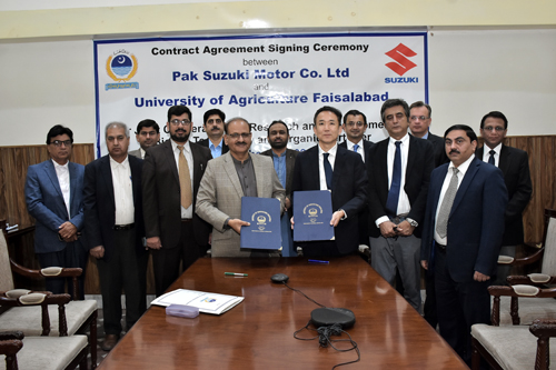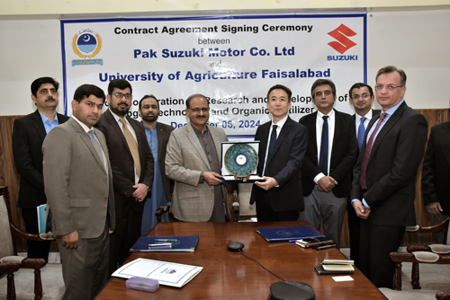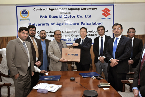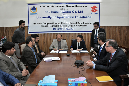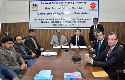 FAISALABAD Dec, 06: The University of Agriculture Faisalabad and Pak Suzuki Motor Co. Ltd. have inked an agreement to collaborate in research and development of biogas technology and organic fertilizer. The accord was duly signed by UAF Vice Chancellor Prof Dr. Muhammad Sarwar Khan and Managing Director Pak Suzuki Motor Co. Ltd. Hiroshi Kawamura. The focal persons of the agreement include Chairman, Department of Biochemistry/ Director, Punjab Bioenergy Institute (PBI), Prof. Dr. Muhammad Anjum Zia from UAF and Executive Officer, Marketing and Sales, Aamir Shaffi and Manager, Business Development Fahad Qamar from PMSC. As per accord, UAF and Pak Suzuki will work together on cooperative research and development initiatives, including research and development on renewable energy, specifically Biogas Plant and Organic Fertilizers, resource exchanges, information transfer, and student training to promote innovation and advance research, education and community service. They area of cooperation includes design and development of biogas plant as per international standards and purification of biogas up to 95~99%. They will collaborate to design and develop organic fertilizer place and will work to develop organic fertilizer products along with development of sales channel of organic fertilizer products. They will engage students in collaborative projects. They will cooperate in research collaboration in areas of mutual interest like international seminars, awareness campaigns, workshops, and conferences. Hiroshi Kawamura added that they were committed to address the different issues for the people. He said that the MoU will come up with tangible result to promote biogas and bio-fertilizer. Prof Dr Muhammad Sarwar said that UAF was taking all possible measures for the clean and green technology. He said that it is housing Punjab Bioenergy Institute (PBI), a step to flourish the biogas. He said that solar system is in the place in the varsity. He termed green technology crucial in the era that is in the grip of serious environmental degradation. He added that each inch of environment depleting poses a serious threat to the ecosystem. UAF experts including Dr. Muhammad Naveed, Institute of Soil and Environmental Sciences; Prof. Dr Imran Arshad, Director ORIC; Prof. Dr. Muhammad Kashif Saleemi, Director External Linkages ; Dr. Muhammad Rizwan Tabassum, Assistant Professor PBI; Dr. Muhammad Ashraf, Consultant PBI, Dr. Muhammad Ghaffar Dogar, Consultant PBI and Pak Suzuki official including Ghulam Hussain Agha, General Manager Business Development; Fahad Qamar, Manager Business Development; Waqar Majeed, Manager Sales Management Central Punjab, and Syed Wajahat Ali, General Manager MKTG & Sales Central Punjab and others attended.