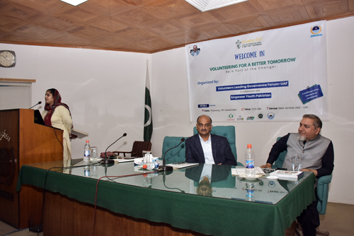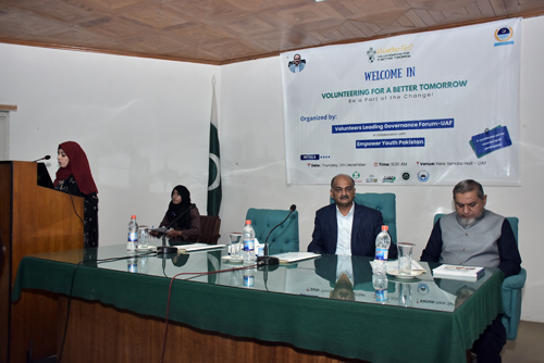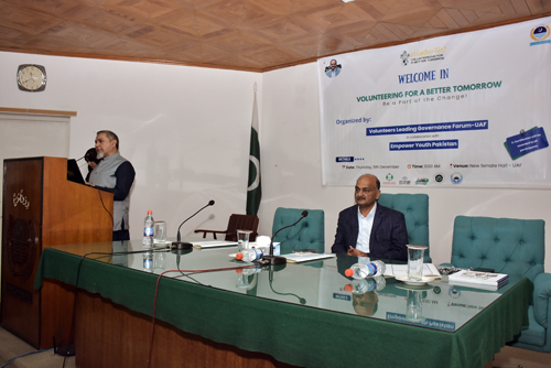FAISALABAD Dec, 06: Speakers at International Volunteers Day stressed upon the need to make conscious efforts for welfare of society as even the little act of kindness can transform the world and make the society better place to live. It was echoed by speakers at University of Agriculture Faisalabad (UAF) while marking International Volunteers Day titled “Volunteering for A Better Tomorrow”, organized by Volunteers Leading Governance Forum – UAF in collaboration with Empower Youth Pakistan. The event was organized on the directives of Vice Chancellor Prof Dr. Muhammad Sarwar Khan. They gave a heartfelt tribute to the selfless individuals who dedicate their time and energy to make a difference. They highlighted the pivotal role of volunteering in addressing social challenges, fostering community resilience and promoting solidarity across the globe. Addressing the audience, Senior Tutor UAF, Dr. Iftikhar Ali encouraged participants to actively contribute their time and skills to create a positive difference in society. He added that at the time, the society was facing the dilemma of hopelessness, increasing economic burden, restlessness and others. If we can help oneself, it would not only redress his grievances but also bring blessings in our lives. Aslam from Saylani Welfare International Trust (SWIT) encouraged students to channel their energy into serving humanity. He shed light on the running services provided by SWIT for the needy people. The services include foods, RO plants, well equipped computer labs, Rashan program etc in the different cities. Police Tahafuz Manzil, Director Operation, Maida Raza Butt emphasized the importance of voluntary work, urging students to extend a helping hand to those in need and encouraging the youth to contribute towards building a compassionate society. SHO Punjab Police Inspector Gulnaz also spoke on the occasion. VLGF members including club president, social media handler, vice president spoke at the event and talked about the vision and core values of VLGF.