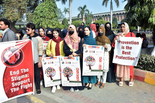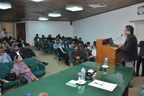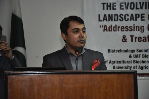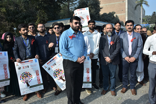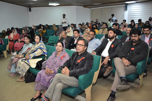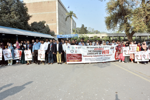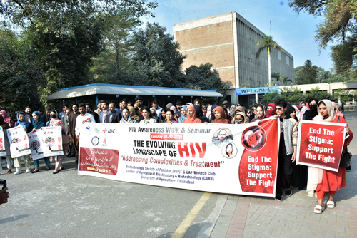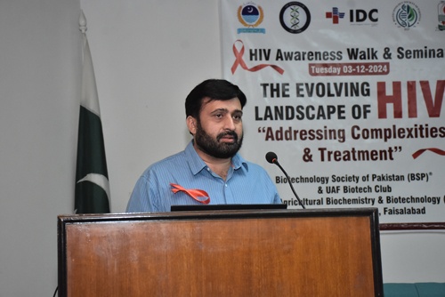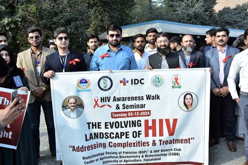 FAISALABAD Dec 04: It is a matter of great concern that Pakistan has the second fastest rate of AIDS spread in the Asia Pacific Region. There has been a massive increase in new HIV infections for the last decade. It was stated by experts while addressing the seminar titled “the evolving landscape of HIV/Aids: addressing complexities and treatment” arranged by Centre of Agricultural Biochemistry and Biotechnology and UAF Biotech Club at New Senate Hall. The event was meant to combat stigma and to highlight the pressing issues surrounding HIV and foster a deeper understanding of its evolving dynamics. UAF Vice Chancellor, Dr. Muhammad Sarwar Khan called for breaking myths, timely treatment and fostering a supportive community for individuals living with HIV. He stressed upon the need for creating awareness and enhanced preventive measures and community engagement to combat the growing threat. Medical expert Dr. Nazia Ehsan, In-charge HIV/AIDS Centre, Allied Hospital, urged the people to put aside fear and misconceptions about the disease. She provided a comprehensive overview of HIV during the seminar, covering its symptoms, causes, treatment options, and historical background. Dr. Sumaira Riaz from University Medical and Dental College said that first HIV case was reported in the country in 1987 caused by unsafe blood transfusion. Whereas in 2004 first HIV outbreak hit the remote area of Larkana due to injection drugs users. Center for Advanced Studies Director Dr. Sultan Habib Ullah said that it is the need of the hour to pace up efforts in order to create widespread awareness and proactive measures to address the alarming trends. Director CABB, UAF, Prof. Dr. Bushra Sadia while emphasizing its importance in spreading awareness about HIV expressed hope that such initiatives would inspire more proactive steps to address the challenges. Dr. Irfan also spoke on the occasion.
