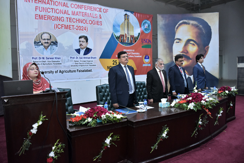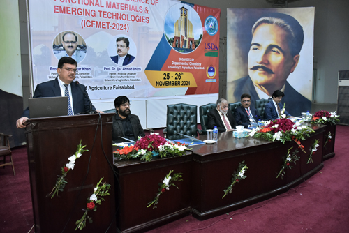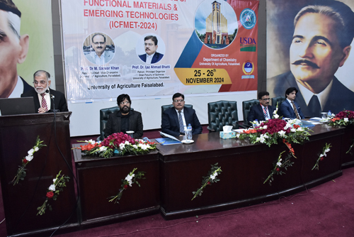 FAISALABAD Nov 25: Speakers at an international moot called for stepped up efforts to integrate materials science in align with community needs specially to promote the environmental friendly technologies. They addressed international conference on “Functional Materials and Emerging Technologies”, organized by the Dept. of Chemistry, the University of Agriculture Faisalabad (UAF) on the directives of UAF Vice Chancellor Dr. Muhammad Sarwar Khan, with prominent academics and professionals shedding light on the transformative role of chemistry in modern life. In a message, UAF Vice Chancellor Prof Dr Muhammad Sarwar Khan said that the university was making all-out efforts to bring the change through quality education, tangible research work and innovation. He said that we have to promote environmentally friendly technologies to address the issues of environmental degradation. Dr. Ijaz Ahmad Bhatti, Dean Faculty of Sciences, UAF said that university was committed to impart skilled-based high quality education. He gave a detailed department’s pivotal role in grooming students for careers in various fields, including Pakistan Atomic Energy, Defense Sciences and various industrial sectors. Dr. Ijaz Bhatti emphasized the department’s research initiatives in specialized areas such as physical, environmental and radiation chemistry and its significant contributions to the advancement of chemical sciences in alignment with the Higher Education Commission’s vision. The conference also explored the critical role of functional materials, their applications, properties and associated challenges. Dr. Bhatti elaborated the growing importance of Artificial Intelligence in driving innovation in the current “silicon age”. Dr. Habib Aslam Gaba praised the efforts of the university and its dynamic youth. He emphasized the indispensable role of chemistry in scientific progress and national development. The event concluded with a vote of thanks by Dr. Haq Nawaz Bhatti, followed by the presentation of a shield to Dr. Habib Aslam Gaba, making the conference highly enriching. Dr Amer Jamil also spoke on the occasion.