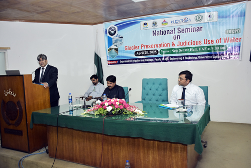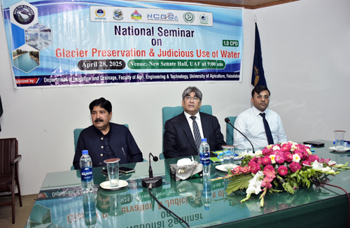 FAISALABAD Apr 28: Around half of the world population, around 4 billion people, experience severe water scarcity for at least part of the year, thanks to accelerating impacts of climate changes and altered rainfall patterns. It is the need of the hour to make foolproof arrangements for glacier preservation and encourage rational usage of water among the masses. It was said by the speakers at a national seminar on “Glacier Preservation and Judicious Use of Water” organized by the Department of Irrigation and Drainage, Faculty of Agriculture Engineering & Technology, University of Agriculture Faisalabad (UAF). Speaking at the event, former Vice Chancellor, Arid Agriculture University Rawalpindi, Dr Rai Niaz Ahmad called for replacing traditional methods of water management with modern ones including bed plantation, sprinkle, drip irrigation and others that will save the water manifold. Dean Faculty of Agricultural Engineering and Technology UAF Prof Dr Anjum Munir emphasized the importance of safeguarding water resources for the survival and prosperity of future generations. He highlighted that water is not merely a resource but the foundation of sustainable agriculture, food security and economic development. He said that only bed plantation saves 50 percent of water while drip, sprinkle and other high efficient techniques save the water upto 80 percent . Dr Farrukh Bashir Director R&D Division Islamabad urged the academic community, industry and other stakeholders to work hand-in-hand to develop research-driven solutions for water conservation and management. Chairman Irrigation and Drainage Dr Adnan Shahid emphasized that sustainable water management is essential not only for agriculture but for the overall stability of the country’s economy and environment. He said that in the face of rapid glacier melting, changing rainfall patterns and increasing demand for water resources, modern irrigation techniques and the efficient use of technology must be promoted. Scientific Officer PARC Dr Muhammad Khalid emphasized the need to modernize water monitoring infrastructure and promote efficient irrigation practices. He urged all stakeholders to work collectively to safeguard the country’s vital water assets for future sustainability. Librarian Umar Farooq said that Water is an important element for sustainable agriculture and its quantity and quality are serious issues to be considered. Glaciers act as natural reservoirs, providing a critical buffer to sustain water supplies for both drinking and agricultural uses. He also shed light on use of digital Library resources on water.