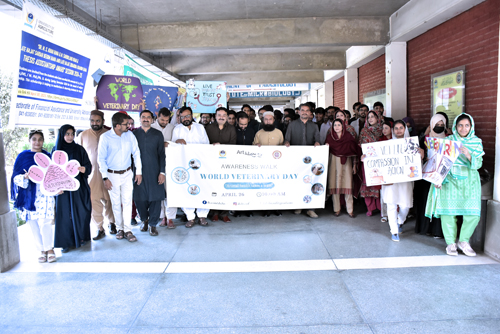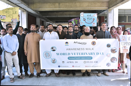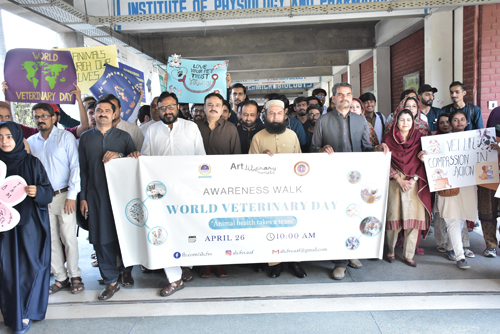 FAISALABAD Apr 26: The Art and Literary Society, Faculty of Veterinary Sciences, University of Agriculture Faisalabad (UAF), marked World Veterinary Day. In this regards, a walk was taken out from corridor of the Faculty of Veterinary Science. A large number of students and faculty members participated in the walk, emphasizing the significance of veterinary professionals in today’s world. Speaking on the occasion, Dean Faculty of Veterinary Science Prof Dr Shahid Mehmood said veterinarians are the guardians of health and wellbeing of the animals. This day reminds us of our responsibility to uphold the highest standards in animal care and public health. He said that they were committed to producing skilled, compassionate and innovative professionals who will shape the future of veterinary science in Pakistan. Dr. Rao Zahid Abbas, Dr. Kashif Saleemi, Dr. Misbah Ijaz and other faculty members were also present on the occasion.