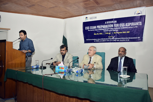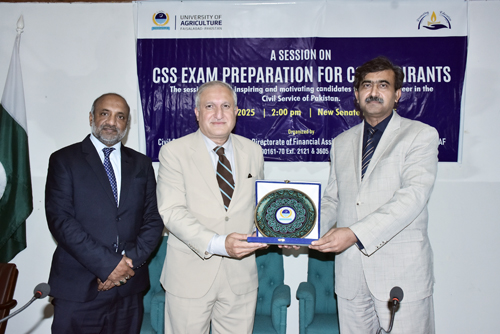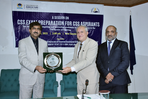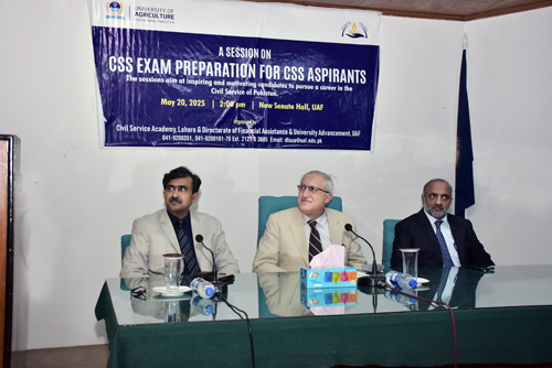 FAISALABAD May 20: Director General of the Civil Services Academy, Lahore Farhan Aziz Khawaja has encouraged the students to prepare themselves for competition no matter you succeed or not but the journey will change your life with out-of-the-box thinking, and enhanced capabilities to fight the odds and work for the development of the country. He addressed the students at the University of Agriculture Faisalabad and delivered a lecture titled career counselling for CSS aspirants. UAF Vice Chancellor Prof Dr Zulfiqar Ali was guest of honor on the occasion. The event arranged by Civil Services Academy Lahore and the Directorate of Financial Assistance and University Advancement UAF. The Pakistan Civil Services Academy (CSA) has launched its National Outreach Program aimed at encouraging university students to pursue careers in civil services, bridging gap between academic institutions and Pakistan’s public administration. Farhan Aziz Khawaja delivered an in-depth lecture tracing the history of civil services. He briefed about the evolution of administrative governance by referencing Plato’s Philosopher King Theory, and explained its influence on the British colonial structure that laid the foundations for Pakistan’s current civil services framework. He explained that today’s structure comprises 12 service groups, including the Pakistan Administrative Service, Foreign Service of Pakistan, and Police Service of Pakistan. He said that youth are the nation’s future and strongly encouraged them to test their capabilities by appearing for the CSS (Central Superior Services) examination. Responding to student inquiries, Khawaja addressed several pertinent topics, including the distinction between federal and provincial civil services, the quota system for armed forces personnel, and the essential skills required to excel in CSS. Prof Dr Zulfiqar Ali urged the students to leave no stone unturned to sharpen their capabilities. He added that it is a world of competition and hardworking and innovative thinking patterns were essenail to excel in the life. He urged the students to devote themselves for the learning and sharpen their skills which is grantee of a bright future.