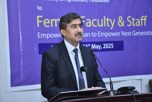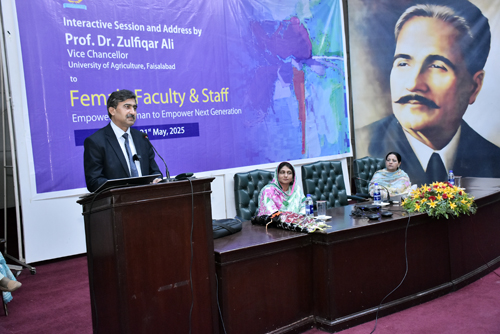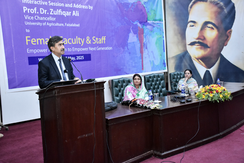 FAISALABAD May 22: Women are playing equally vital role as men in the growth and progress in our society. No nation can truly succeed without empowering its women to become professionally strong and confident. It was said by University of Agriculture Faisalabad (UAF) Vice Chancellor Prof Dr Zulfiqar Ali in an interactive session with the female faculty and staff, providing them with a platform to share their ideas, suggestions and concerns. Addressing the gathering, he emphasized the university’s commitment to empowering women. He said our women are progressing on merit and confidently taking on leadership roles and they are now well aware of their rights and responsibilities. He said that UAF is continuously working to create a more comfortable and supportive environment for its female employees and trying to eliminate the challenges that hinder women’s leadership roles in the university. Dean Faculty of Arts and Humanities Prof Dr Shazia Ramzan, Prof Dr Bushra Sadia and other notables spoke on the occasion.