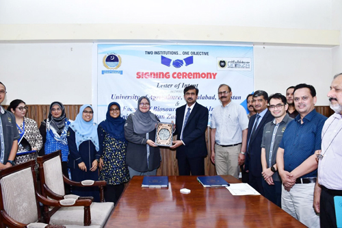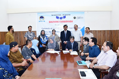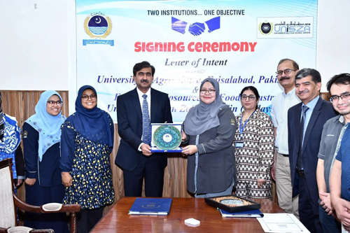FAISALABAD May 30: University Sultan Zainal Abidin (UNISZA) Malaysia and University of Agriculture Faisalabad (UAF) inked a Memorandum of Understanding (MoU) to strengthen the academic and research ties. Eight-member delegation from the Malaysian university visited UAF to explore R&D collaborations with UAF. The delegation led by Dr Nornasuha Bint Yusoff, called on the UAF Vice Chancellor Prof Dr Zulfiqar Ali. The Vice Chancellor said that the collaboration will help learn from each other’s experiences and to address common challenges. He said that Malaysia was proving its mettle in terms of industrial development and education across the globe. He added ties with the Malaysian university would bring tangible results to excel in the field of education and research. He said UAF, in collaboration with Malaysian High Commission, Islamabad is used to frequently hold seminars invariably every year to explore new Research and Development (R&D) and business opportunities between the two brotherly countries. The meeting was attended by Dean Faculty of Agriculture Dr Ghulam Murtaza, Director ORIC Prof Dr Muhammad Imran Arshad, Director External Linkages Dr Muhammad Tehseen Azhar, Dr Nadeem Akbar, Dr Bushra Sadia, Dr Amir Maqsood, Dr Waseem Akram, Dr Ahmad Sattar Khan, Dr Abdur Rehman Bhatti, Dr Tehsin, Dr Irfan, Dr Muhammad Ahsan, Estate Officer Shahzad Mahmood and others.