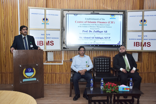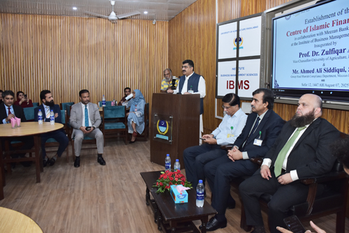 FAISALABAD Aug 7: The University of Agriculture Faisalabad (UAF) has established the Center of Islamic Finance meant for scaling up Islamic financial literacy, producing quality human resource and entrepreneurs in the said financial system for a better tomorrow. The center worth Rs 2.5 million is set up in collaboration with Meezan Bank Limited at the Institute of Business Management Sciences and inaugurated by UAF Vice Chancellor Prof Dr Zulfiqar Ali and Meezan Bank Deputy Head Shariah Compliance Department Shayan Ahmad Baig. Meezan Bank GM Faisalabad Moazzam Saeed, Dean Social Sciences Dr Babar Shahbaz, Director IBMS Dr Abdul Ghafoor and all faculty members of the institute attended. The center was meant for training sessions, Degree programe on Islamic Finance and tangible research work. Addressing on the occasion, Dr Zulfiqar Ali said that the center will also assist in promoting the innovation, and technology commercialization with the help of Islamic financing. He added that Islamic financing has gained the immense popularity across the globe and we should reap its benefit for prosperity. He said that the university was housing Business Incubation Center and National Incubation Center that are producing the entrepreneurs and helping establish startup so that they can become job provider rather than job seekers. He urged the center to develop the financial model of the university as per Shariah Compliance. Shayan Ahmad Baig said that the country sets 2028 deadline for complete transition to Islamic banking. He said that under the center, trainings and other Islamic financial aspects will be promoted and this center emerge Model center of the region. He said that the Bank promotes the slogan of make Islamic Banking the first choice. He said that they had worked with IBA to pace up the said financial system. Dr Babar Shahbaz said that Islamic banking is a growing sector globally. He said Islamic financial literacy is essential for young entrepreneurs seeking business models. He added that the university is committed to equipping students with knowledge of both financial system. Dr Abdul Ghafoor said that Meezan Bank is the pioneering Islamic bank in the country. He said that the university in collaboration with Islamic Financial Institute will start new degree programs in the said field. He said that they are tacking all possible to produce trained men power. Dr Sahar Munir said that academia-industry linkages will pave a way for knowledge economy. She shed light on the Islamic financing system.