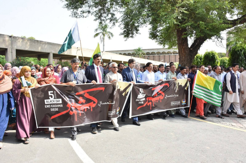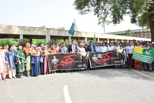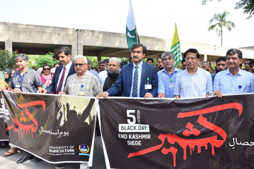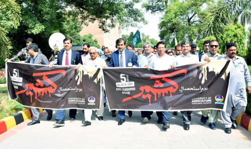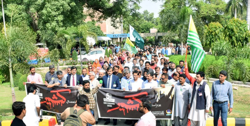 FAISALABAD Aug 5: The University of Agriculture Faisalabad on Tuesday took out a rally to mark Youm-i-Istehsal (Day of Exploitation) to protest India’s revocation of the special status of Kashmir in 2019. The rally was led by UAF Vice Chancellor Prof Dr Zulfiqar Ali and arranged by the Senior Tutor Office. The rally commenced from Admin Block and concluded at University clock tower. He said that nation stands united in support to the Kashmiris in their legitimate struggle for self-determination, reaffirmed by the international community in numerous United Nations Security Council (UNSC) resolutions. He slammed oppression in Indian Held Kashmir which is clear violations of international laws. He urged the enhanced role of world to solve the issue. He said the Indian government on August 5, 2019, had revoked occupied Kashmir's special status by repealing Article 370 of the constitution. He urged the world to play its role to end the Indian terrorism in IHK. All Deans, Directors, Registrar, Treasurer and a large numbers of faculty members and students participated. Senior Tutor Dr Shoukat Ali said that India should stop denying ground realities, must come out of illusions and accept the fact that it cannot suppress the voice of Kashmiris.