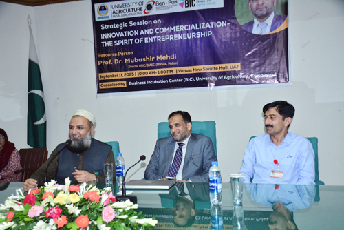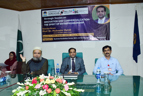 FAISALABAD Sep 12: Entrepreneurship is not only a pathway to self-reliance but also a powerful tool to address concerns like unemployment and poverty. It was stated by Prof. Dr. Mubashir Mehdi, Director ORIC/ BIASED, Muhammad Nawaz Shareef University of Agriculture (MNSUA) Multan, at a session on “Innovation and Commercialization– The Spirit of Entrepreneurship” organized by Business Incubation Center (BIC), University of Agriculture Faisalabad (UAF). Talking to the participants, Dr Mubashir said that entrepreneurship transforms ideas into practical solutions that directly contribute to societal wellbeing. He said that small businesses can play significant role in economic growth and job creation and it is need of the hour to encourage young generation to create opportunities that will reduce dependency, alleviate poverty and generate sustainable jobs. He stressed upon youngsters to bring innovation to their products so that they can find a place in the market. ATRI Principal Officer Prof. Dr. Rao Zahid Abbas highlighted that entrepreneurship must be promoted among youth. He said that Pakistan’s youth is its greatest asset. By channelizing their talent into entrepreneurial ventures, we can tackle socio-economic challenges more effectively. Strategic sessions like this instill confidence in young graduates to transform innovative concepts into business models. Director Business Incubation Center (BIC) Prof. Dr. Iftikhar Ahmad said that by fostering innovation and commercialization we can not only prepare our youth for self-employment but also strengthen the economic landscape. He said that commercialization strengthens the industry-academia linkages. He also shared insight on Vice Chancellor vision to promote entrepreneurial ecosystem at campus and shared BIC initiatives and upcoming events details.