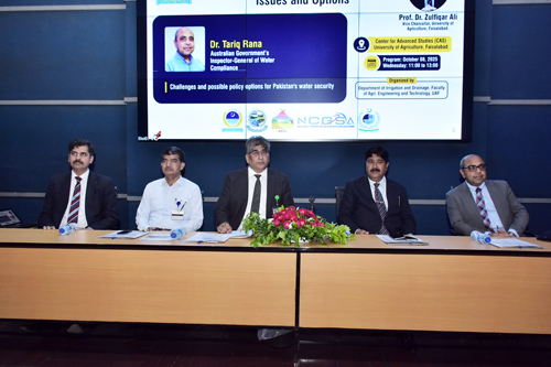 FAISALABAD Oct 08: Water scarcity is posing a serious threat to food security, environmental sustainability and making it difficult to meet the needs of ever increasing population of the country. It was stated by the speakers at a seminar on “National Water Security: Issues and options” organized at Center for Advanced Studies (CAS) at UAF. The event was arranged by department of irrigation and drainage, Faculty of Agriculture Engineering. Addressing the gathering Dr Tariq Rana serving with the Australian Government's Office of the Inspector General of Water Compliance as Director of Water Resource Plan Compliance, as the keynote speaker of this seminar said that Sustainable Development Goal 6 seeks to ensure the availability and sustainable management of water and sanitation for all. He said water is the key driver of all economic and social development. He added water also has a deep function in maintaining the integrity of the natural environment. If we are to achieve water security, protect vulnerable water systems, mitigate the impacts of water-related hazards such as floods and droughts, safeguard access to water, functions and services, and manage water resources in an integrated and equitable manner. Dean Agriculture Engineering Dr Anjum Munir said that Declining groundwater levels, deteriorating water quality, hydro-climatic hazards in terms of floods and droughts, and transboundary water concerns demand urgent attention. To address these challenges, it is important to explore viable options for sustainable water management. Dr Rai Niaz, former Vice Chancellor Arid Agriculture University said that growing population, rapid urbanization, climate change, and inefficient water use practices are intensifying the pressure on already scarce water resources. Dean Agriculture Dr Ghulam Murtaza said that the water scarcity was complex issue for which we have to adopt the water saving methods. Dr Asif Kamran said that policy interventions will help address the issue. Dr Adnan Shahid said that he Department of Irrigation & Drainage, Faculty of Agricultural Engineering and Technology, is committed to advancing solutions for the country's water challenges. As part of these efforts.