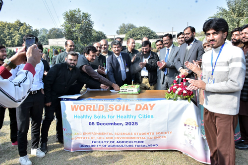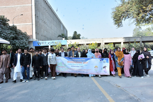 FAISALABAD Dec 5, 2025: The University of Agriculture Faisalabad took out a rally to mark the world soil day 2025. It was arranged by Institute of Soil and Environmental Sciences UAF. Leading the walk, UAF Vice Chancellor Prof Dr Zulfiqar Ali said that our soils were being degraded due to climates changes and human activities. He said that sustainable soil management practices reduce erosion and pollution. He stressed upon the need to preserve soil biodiversity, improve fertility, and contribute to carbon sequestration, playing a crucial role in the fight against climate change. Dean Faculty of Agriculture Prof Dr Ghulam Murtaza said that World Soil Day (WSD) is held annually on 5 December as a means to focus attention on the importance of healthy soil and to advocate for the sustainable management of soil resources. Dr Sanaullah, Dr Anwarul Haq, Dr Iqbal and other notables participated..