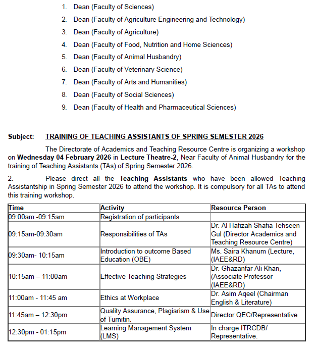 The Directorate of Academics and Teaching Resource Centre is organizing a workshop on Wednesday 04 February 2026 in Lecture Theatre-2, Near Faculty of Animal Husbandry for the training of Teaching Assistants (TAs) of Spring Semester 2026. Please direct all the Teaching Assistants who have been allowed Teaching Assistantship in Spring Semester 2026 to attend the workshop. It is compulsory for all TAs to attend this training workshop.