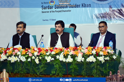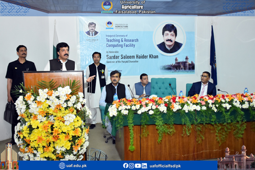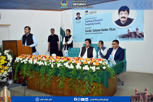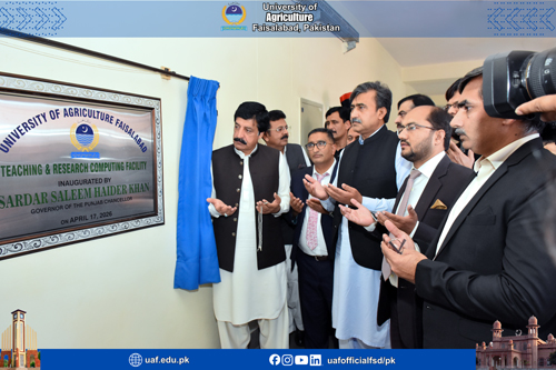 FAISALABAD April 17: Governor Punjab Sardar Saleem Haider Khan on Friday said that agricultural scientists must undertake tangle research initiatives and develop high-yield varieties to ensure food security and tackle challenges including climate changes, water scarcity and others. He expressed these views during a visit to the University of Agriculture, Faisalabad (UAF), where he inaugurated the Teaching Research Computing Facility at the Faculty of Sciences and addressed faculty members at the New Senate Hall. Expressing concern over the agricultural imports, the Governor said that despite being an agricultural nation, the country imports billions of rupees worth of agricultural commodities annually. He said that the nature has blessed with four seasons, ecosystem and talented people. He called for pacing up the efforts to increase the per acre productivity. Talking about the Computing Facility, the Governor remarked that the donation of 1,000 computers by TT Global Foundation to the university is a commendable act that will enhance education and research. He said that the government is striving hard to provide state-of the-art facilities and enhance public-private partnerships to address the challenges. He also praised the education-friendly efforts of TT Global Foundation CEO, Faisal Shehzad and UAF Vice Chancellor, Dr. Zulfiqar Ali. On the geopolitical front, he highlighted that the world recognizes the commendable role of Armed forces and Pakistani government in the U.S.-Iran conflict to bring peace in the region, earning the country international acclaim. He praised the services of President Asif Ali Zardari, Prime Minister Shehbaz Sharif and Chief of Defence Forces and Chief of Army Staff Field Marshal Asim Munir, saying that the peace would also lead to foreign investment and new avenues of development in the country. Vice Chancellor Dr. Zulfiqar Ali highlighted the university's academic excellence, noting that 48 UAF scientists are ranked among the top 2 percent scientists of the globe. He shared that the university has strengthened its global reputation by securing the 33rd position in the subject of Agriculture and Forestry according to the QS Rankings. Additionally, the university secured the 61st position in Veterinary Science worldwide. The Vice Chancellor praised the government’s education-friendly policies and stressed that digitalization has become a vital necessity for development in the modern era. He expressed gratitude to the TT Global Foundation for its support and commended Dr. Waseem Akram, Chairman of Entomology, UAF services in this regard. He said that active measures are being taken to improve the student-teacher ratio at the university and ensure quality education and research works.