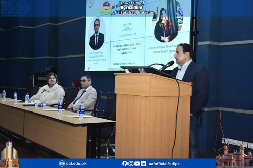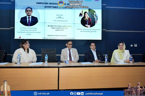 FAISALABASD April 23: In a world that is rapidly evolving, the understanding of human diversity is no longer a choice, it is a necessity. It was said by Dr Imtiaz Dogar, the Head Department of Psychiatry and Behavioral Sciences Faisalabad Medical University while addressing a seminar titled “Embracing Neurocognitive Differences: Acceptance is First Step”. The event was organized by the Institute of Home Sciences at University of Agriculture Faisalabad (UAF). Dr Imtiaz said that neurocognitive differences are not weaknesses, they are not limitations and they are certainly not something to be fixed instead they are variations of the human mind. He said that every individual has unique abilities that deserve recognition and respect. He stressed that it is our collective responsibility to create supportive environments where individuals feel valued, understood and included, so they can confidently contribute to society. Dean Faculty of Food, Nutrition and Home Sciences Dr Imran Pasha said that awareness and understanding must go hand in hand with progress. He noted that the theme of this seminar highlights a very simple yet powerful message—that every individual deserves respect, acceptance and equal opportunities. Dr Samreen Afzal briefed about thinking pattern and psychological aspects. She said that such platforms play an important role in promoting awareness, understanding and mutual respect in our society. Director Institute of Home Sciences Dr Beenish Israr said that as members of an academic community, it is our responsibility to promote a culture that values diversity in all its forms. She said that differences are a natural part of human variation and by acknowledging this we take a step toward building a more inclusive environment. Alveena Haseeb, and others also spoke on the occasion.
