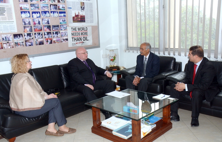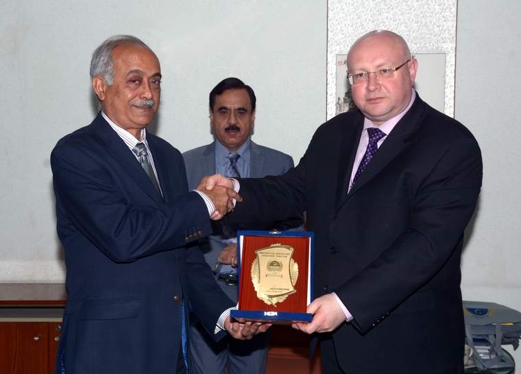 Belarus Ambassador to Pakistan Andrei Ermolovich on Wednesday said Belarus and Pakistan agricultural and academia ties will be further strengthened to get benefit from each other experiences. He addressed a meeting of University of Agriculture Faisalabad deans and directors at Syndicate Room that was presided over by UAF Vice Chancellor Dr Iqrar Ahmad Khan. Embassy Counselor Vladimir Papsuev also attended the meeting. The Ambassador said that Pakistan and Belarus will hold agriculture forum next month in which experts from both countries will participate in Islamabad and will discuss areas of mutual concern. He added that Belarus was producing the advanced agriculture machineries to uplift agriculture production. He further added that Faisalabad is the hub of agricultural institutions for which they would develop the collaboration to address the issues of agriculture sector. He added that strong academia and research linkages between the both countries are helping further cemented ties. He cited that they have inked 20 memorandum of understanding MoUs between academic institutions of Belarus and Pakistan. He said that Belarus had about 10 million population as they had developed a strong farm machineries industries, livestock sector and information technology. He said that they had established tractor manufacturing plant in Karachi whereas they are planning to expand this program to other cities. He told the meeting that they are producing thousands of I.T experts every year. He said that transit route between the Europe and Asia gave a trade line worth billions of rupees. UAF Vice Chancellor Dr. Iqrar Ahmad Khan sought the Belarusian cooperation in strengthening farm machinery sector in Pakistan and strengthening livestock, veterinary and agriculture sector. He further added that Pakistan was receiving modern tractors from Belarus and stressed upon the need to develop linkages in other farm machineries as well. He said that UAF will ink MOU with Belarus Agriculture institutions to open up new research in agriculture sector. He also suggested establishing agro industrial park in collaboration with Belarus at the UAF. He said that UAF had already inked MOUs with a number of international universities. He said that a Korean innovation park was being established at the UAF. He said that the University was housing USAID funded US Pakistan Center for Advanced Studies in Agriculture and Food Security. He said that new inventions in agriculture must be reached at society and generating new technologies are priority for us.