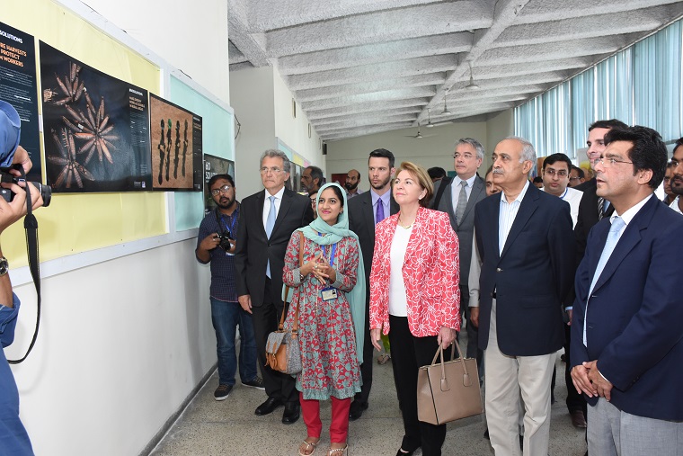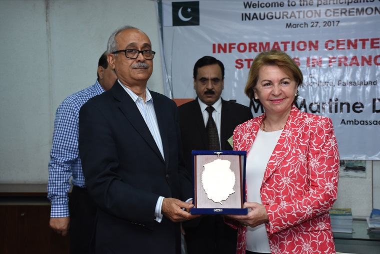 French Ambassador Martine Dorance on Monday called for further cementing academia and research ties between the both countries to get benefit from each other experiences. She was addressing Deans and Directors meeting at the University of Agriculture Faisalabad that was chaired by UAF Vice Chancellor Prof Dr Iqrar Ahmad Khan. She also inaugurated French Information Centre in main library of UAF. Whereas French language and cultural center is already being run at the UAF. The envoy was flanked by French Higher Education Attaché Sebastien Cartier; Cooperation Attaché Olivier Huynh-Van and Philippe Garnier. The ambassador that her country would like to have more Pakistani students in French institutions for knowledge sharing. She said that the Information center would help the students to get the information and guidelines for the admissions in the Universities in France. She said that Pakistan and France had been enjoying long term ties since 1947. Talking about climate changes, she said that the climate changes were posing a serious threat. The people must be educated about the climate changes and environment. She said that his country meteorological institute would sign MoU with Pakistan Meteorological Department. She said that her country was contributing in the fight against terrorism in order to end the menace. She viewed that French delegation comprising the members from agriculture business, food industry and halal meat will visit Pakistan that will open up new horizon of the collaboration. She added that Pakistan had the huge potential in the agriculture especially the halal meat. She added that students and teachers exchange programs between both countries will help fight the different challenges. She lauded the steps being taken on the part of the UAF for providing the quality education and research work. She also said that UAF collaboration with French institutions would be further strengthened UAF Vice Chancellor Dr Iqrar said dozen of teachers from faculty staff were graduated from French universities, who can help students with their experiences to get admission in French universities. He said that the university was enjoying the good relations across the globe. He said that French Culture Center and Chinese Confucius Center were operating at the campus that brought the people closer. He lauded the steps being taken on the French institutions especially to address the climate changes. He said that in the recent past, the Planning Commission of Pakistan has approved establishment of Korea Hi Tech Innovation Park worth 30 million dollar that will help the fight the challenges of agriculture and food security. He viewed that UAF old campus is a candidate to be declared as the UNESCO heritage. He said the UAF students of French language can be a part of the French companies functioning in our homeland. She also inaugurated Lyallpur Literature Festival in which 20 universities are taking part. the festival comprising naat, qirat, speech, drams and folk song competition will continue by April 1