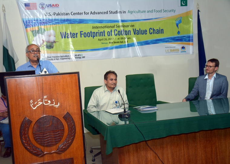 Industrial effluent is polluting groundwater reserves badly, resulting in the outbreak of diseases and environmental pollution whereas the crops and vegetables, which are being cultivated by this water, can cause serious health hazards. It was echoed by experts at international seminar titled “water footprint of cotton value chain” jointly arranged by U.S –Pak Center for Advanced Studies for Agriculture and Food Security and Faculty of Agri Engineering and Technology, University of Agriculture Faisalabad . UAF Vice Chancellor Dr Iqrar Ahmad Khan stressed upon need to step up efforts to control effects producing with chemical waters released by industry. He said that industry is polluting ground water which is harmful for agriculture and drinking usage and urged the experts, scientist and policy makers to play their effective role to cope with the challenge of pollution He viewed that one of the major socioeconomic challenges was the mismanagement of water resources. He said that there is no life without water as the water is key for irrigation, food insecurity, economic growth, energy production, industries and human health. He said time is ripe for promoting the rational use of water across the country to save coming generation. He added we are not treating industrial waste that was causing the deteriorating situation. He said that heavy water was being pumped out from tube-wells that is the responsible for lowing down the groundwater level and worsen water health. Talking about water efficient crops, he added that we need to promote less water intensive crops in view of water shortage in country. Water reserves has been shrank from 5000 Cusic meter to 850 cusic meter . Dr Franck Andreas Weber from Aachen University Germany, Nitrate pollution for the ground water was a largest challenge in Germany. He said that the step up efforts are needed to address the issue of the increasing pollution. He said that Pakistan-Germany enhanced ties in academic and research would help address the issue. He said that water shortage has been facing allover world and it can pose a threat to food security. Dr Bernhard Tischbein from Bonn University Germany said that rivers are also being polluted due to the effluent of industries. He said that the collaborated efforts and interdisciplinary approaches are vital to fight the issue and to provide a healthy environment for the people. Dean Faculty of Agri Engineering Dr Allah Buksh said that industrial effluent treatment was essential to provide the healthy environment to the citizen. He stressed the need to expedite the joint efforts for the cause. He said that it is the need of the hour to treat the industrial and waste water. He said that the climate changes are posing the serious threat to the people and Pakistan was its worst victim. Dr Christopher Conrad said natural ecology system was suffering. He said that the industrial; effluent was posing a serious threat if tangible steps are not taken. Dr Christian Grim and Dr Usman also spoke.