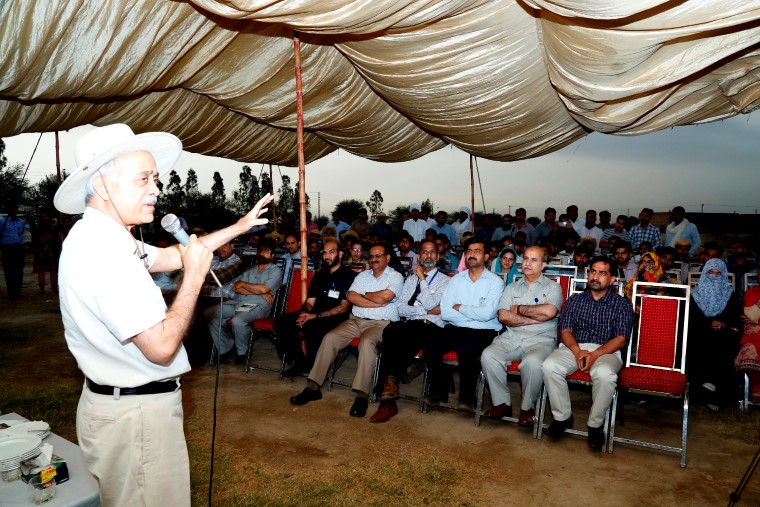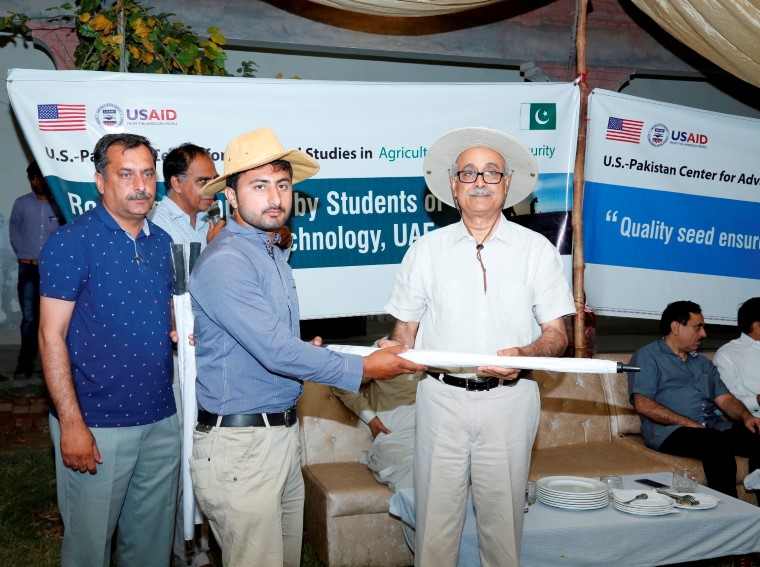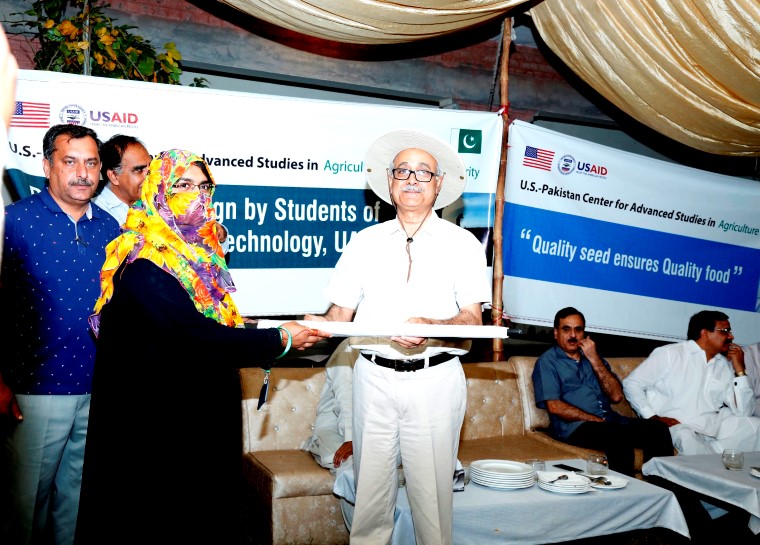 USAID funded U.S.- Pakistan Center for Advanced Study in Agriculture and Food Security launched Roguing and Harvesting Campaign by Students of Newly Initiated Degree program MSc (Hons.) Seed Science & Technology at Proka Research Farm on Saturday April 22, 2017. Roguing is the process to eradicate other than breeding verity plants from testing trial spot. This process is adopted for the purification of seed. The purpose of this campaign was to provide hands on training to New Degree Program scholars for ensuring purity of seed during breeding process. Prof. Dr. Iqrar Ahmad Khan (S.I) Vice Chancellor UAF/Chief of Parity USPCAS-AFS was the chief gust on this occasion. He urged the need for Short duration, water stressed and heat tolerant crop verities to meet the challenges of food Security in the country. Wheat breeder Prof. Dr. Zufiqar Ali briefed about the new wheat verity which is water efficient. Director Farms Dr. Farooq Ahmad also spoke on the occasion. As many as 140 Students of Seed Science & Technology and plant breeding & Genetics participated the campaign. Vice Chancellor Prof. Dr. Iqrar Ahmad Khan (S.I) distributed Umbrellas to the students, they were also decorated with certificates.