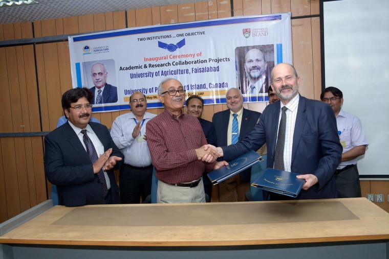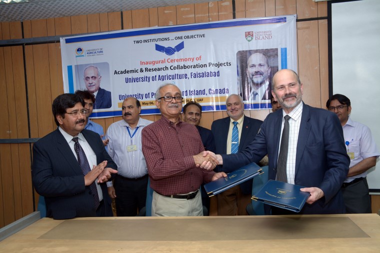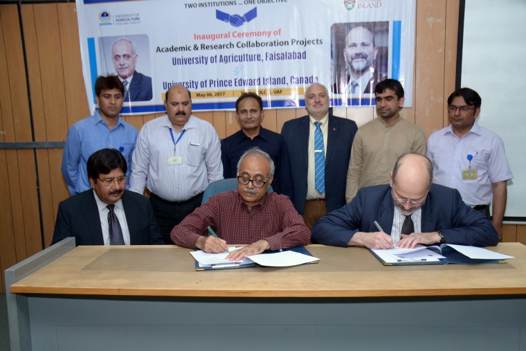 The University of Prince Edward Island Canada and University of Agriculture, Faisalabad have inked two Memorandum of understanding to collaborate in the area of research and academia. The MOUs was duly inked by UAF Vice Chancellor Prof. Dr. Iqrar Ahmad Khan, and Canadian Associate Dean Nick Krouglicof on the behalf of Canadian university President Dr. Alaa Abd-Ei-Aziz. According to the agreement, exchange of academic staff and students will be carried out whereas the exchange of researches will also be made. They would continue working on the developing 1+3 undergraduate degree program in engineering. The students enrolled in this program will complete one year at UAF and remaining three year at UPEI. The both sides would also explore the potential program for the collaboration. Arid Agri University Rawalpindi Vice Chancellor Dr Rai Niaz Ahmad, Canadian varsity Director Industrial Partnership Dr Allan Dale, UAF Dean Faculty of Agriculture Engineering Dr Allah Buksh, UAF Director External Linkages Dr Rashid Ahmad, and other notables also attended the event.
