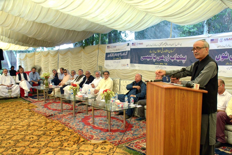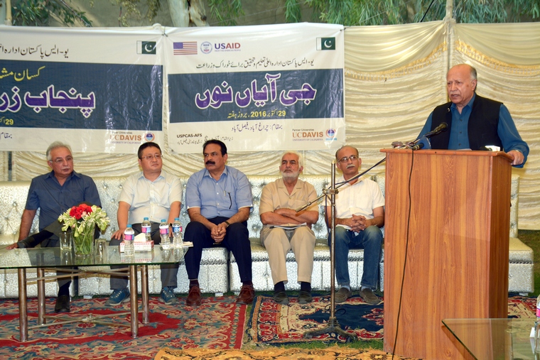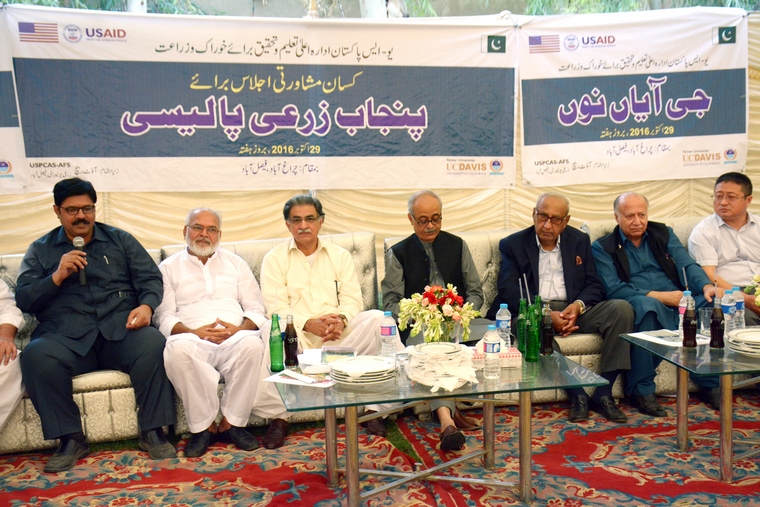 Agricultural experts and farmers have called for addressing the issue of water scarcity, deteriorating ground water quality, and decreasing groundwater level in the agriculture policy . They were addressing at farmers consultative meeting on Punjab agricultural policy arranged by US Pakistan Center for Advanced Studies in Agriculture and Food Security, Outreach Chair, University of Agriculture Faisalabad (UAF) at the farm of Sarwat Malik. Chairing the session, UAF Vice Chancellor Prof Dr Iqrar Ahmad Khan said that the per capita water availability in the country has decreased to 1000 cubic meter which is putting us in the red zone in per water availability index. He said that 1.2 million tube wells were operating in the country, deteriorating the quality of ground water. Every year, 2 to 3 foot underground water was going down. He said that we are not rationally pumping out ground water. He called for constriction the dams in order to face the challenges as we are sending a lot of water back to the seas. He said that the modern irrigation like drip and sprinkle would help address the issue. He said that Faisalabad was presenting a situation like Thal 150 years ago. He said that then British government had come up with a viable canal system that gave life to this barren land. He also suggested that barren land in Baluchistan can be converted into a fertile land by addressing the issue of water. He lamented that the rice is highly water intensive crop. We are exporting the rice of Rs 2 billion at the cost of water costing Rs 10 billion. He demanded a shift in policy to put a focus on water efficient crops. He also said that subsidy was a hurdle to create an atmosphere of competiveness. He said that subsidized sector can not be profitable. He said that vibrant market and value addition mechanism in agriculture sector was the need of the hour. It is the weakest area in our country. He said that the Punjab government was making all out efforts to address the problem of the farming community. The meeting was a part of that efforts in order to get suggestion from the farmers for redesigning the agricultural policy. He said that subsidy in the agriculture sector was a hurdle to create the atmosphere of competitiveness in the agricultural sector. He said no subsidized sector can’t be profitable. He also suggested phasing out the subsidy that will ultimately create an environment of competitiveness and result in growth in production. Progressive farmer Khalid Malik said that land in Sindh and Balochistan barren said that only two dams in Pakistan and we have not added any big dams for the last 40. He said that India had set up more than 150 dams and blocking our water. He said that the Indus water treaty needed to be revisited . Vice President Citrus Association Ibad Khan called for developing the certified seed. He said that the cost of the production was increasing, narrowing down the income of the farmers. He said that mechanism about proper profit of the farming community must be devised to address the problems of the farming community. Progressive Farmer Faisal Shah said that there is a need to develop a system of modern trends to increase the per acre production that will rise the income of farming community. He said that we don’t need subsidy we need modern system to increase the productivity. He said that it is a matter of concern that despite being the surplus in all major crops, the county was standing 108 number in global hunger report index. He said that ground water of India has been badly hit due heavy pumping caused to free electricity on tube well Progressive Farmer Fareed Noon said high efficient system and big dams were imperative to address the issue. He also called for Drip and sprinkle irrigation Dr Afzal Rizvi said that there is need to analyze the domestic agri production and import relation. He said increase in production was adding the woes of the farmers. Whereas the prices of the commodity don’t increase. He said that we have to give rights to the rural population in the education, health and electricity. Dr Noshaba said post harvest were causing the loss worth billions of rupees. We have to promote the packing in fruits and vegetables also. Hamid Mali called for developing the ground water recharge policy. He lamented we are dumping 35 MAF every year to the sea. He said that for the last 40 years, we have failed to develop the big dams. Mian Shoukat said that we have to make the rational use of water and we are exploiting our resources from our own hands. He stressed upon the need of a good agriculture policy keeping in view the present and future challenges.He said that the Punjab government was making all out efforts to address the problem of the farming community. The meeting was a part of that efforts in order to get suggestion from the farmers for redesigning the agricultural policy. He said that subsidy in the agriculture sector was a hurdle to create the atmosphere of competitiveness in the agricultural sector. He said no subsidized sector can’t be profitable. He also suggested phasing out the subsidy that will ultimately create an environment of competitiveness and result in growth in production. Progressive farmer Khalid Malik said that land in Sindh and Balochistan barren said that only two dams in Pakistan and we have not added any big dams for the last 40. He said that India had set up more than 150 dams and blocking our water. He said that the Indus water treaty needed to be revisited . Vice President Citrus Association Ibad Khan called for developing the certified seed. He said that the cost of the production was increasing, narrowing down the income of the farmers. He said that mechanism about proper profit of the farming community must be devised to address the problems of the farming community. Progressive Farmer Faisal Shah said that there is a need to develop a system of modern trends to increase the per acre production that will rise the inco