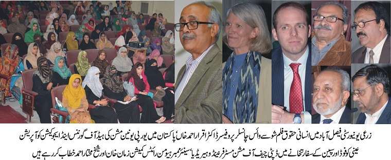 The University of Agriculture Faisalabad on Thursday kicked off three-day Chrysanthemum flower exhibition and arranged one-day film show in order to mark the international human right day. The documentary show was arranged in collaboration with European Union in which two documentaries highlighting the issue of human rights were put on display at Iqbal Auditorium in which tens of the hundreds students participated. The events were inaugurated by Anne Kofoad, First Secretary, Head of Governance, Education Cooperation, European Union; Deputy Chief of Mission Embassy of Spain Fernado Heredia; UAF Vice Chancellor Prof Dr Iqrar Ahmad Khan and Human Rights Commission senior member Zaman Khan. Addressing on the occasion, Anne Kofoad, First Secretary, Head of Governance, Education Cooperation, European Union said that the show provides an opportunity to debate on the human rights in Europe and in Pakistan. She called for making all efforts to ensure that human rights are cultivated, protected and enforced at all level. She said that they are celebrating the 2015 International Human Rights Day in Pakistan by screening the films in Islamabad, Faisalabad, Lahore and Karachi to highlight the issue of the human rights. UAF Vice Chancellor Prof Dr Iqrar Ahmad Khan said that Islam teaches us to serve the humanity in respite of creed, color and gender. He said that the collective efforts are needed to raise the awareness among the people about the human rights. He said that the flower exhibition was arranged to give the message of peace and human rights to the people. The flower show also remained the centre for attraction for the flower lovers who thronged the varsity to have the delight of autumn flower. The flowers blossoming with all beautiful shades mesmerized the nature lovers. The dozens of different flower arrangements displaying colours of creative ideas are set up by university students and other organization. The exhibition is based on the different theme. Senior Tutor Athar Javed also spoke on the occasion