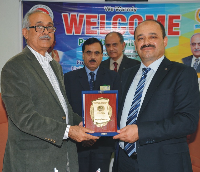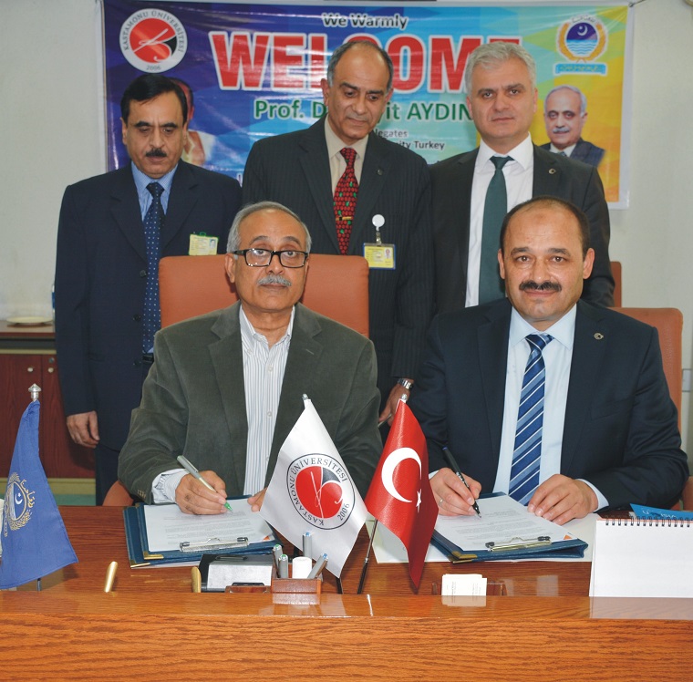 The University of Kastamonu Turkey and the University of Agriculture Faisalabad on Saturday inked an Memorandum of Understanding in the area of research and education. The agreement was duly inked by Rector University of Kastamonu Dr Sayit Aydin and UAF Vice Chancellor Prof Dr Iqrar Ahmad Khan. In the MoU, it was agreed upon about the staff and faculty exchange; students exchange at graduate and undergraduate level; development and realization of joint educational programmes including double degree diploma awarding. It was also agreed upon to carry out joint research activities. Both organizations would be organizing academic meetings and symposiums and agreed upon exchanging the academic information, publications materials and knowledge. Talking to the participants, the visiting rector of Kastamonu University Turkey Dr Seyit Aydin hoped that mutual cooperation between both the institutions would lay a firm foundation of more R&D activities. He said that owing to growing S&T activities between institutions of the Muslim world, the 1.8 billion Muslim population would gear up the economic development activities that would fetch them out of poverty and hunger. During the signing ceremony, the Vice Chancellor Dr Iqrar Ahmad Khan said that UAF in association with British Council is going to hold a Distinguished Innovation and Entrepreneurship Event among the universities across the country enabling the university studies to showcase their professional skills and start their own business. He said UAF was enjoying good relations with Turkish seats of higher learning and also working with TIKA in a poverty Alleviation Program in rural areas of the country.