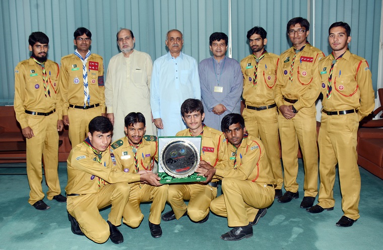 The University of Agriculture Faisalabad has become Champion of the All Pakistan Inter-varsity Rovering Championship 2014-15 for the ninth time out of total ten times. This year, teams from 17 universities across the country participated. In the championship, BZU got the second position while the GCUL got the third position. The championship first time was kicked off in 2003 as an initiative of Higher Education Commission. The championship comprises different segments including A group photo of UAF Vice Chancellor Prof Dr Iqrar Ahmad Khan with the winning UAF team of All Pakistan Inter-varsity Rovering Championship 2014-15 Hiking, Camping, Knots & Lashing, Cooking, Pioneering, Campfire, First Aid ,Quiz and Trekking etc. All Pakistan Rovering Intervarsity Championship 2015 was held at The University of Poonch, Rawlakot, AJK. UAF Vice Chancellor Prof Dr Iqrar Ahmad Khan in a meeting with the scout congratulated Agrivarsity Scouts Group for such a marvelous achievement. He said the UAF students and scouts are committed to working for humanity especially at the time of disasters such as floods. He said that the UAF was making all out efforts to flourish the culture of sports in the varsity. He stressed upon the need to promote the sportsman spirit among the youth in order to excel in every sphere of life. Chairman Sport Board Prof Dr Ahsan Ul Haq said that tangible steps are being taken to flourish the God-given qualities of the students. Dr. Ahmad Sattar Khan (President Rovering Team), Rovering Team Vice President Dr. Aamir Shahzad, Captain Muhammad Aqeel and others were also present on the occasion