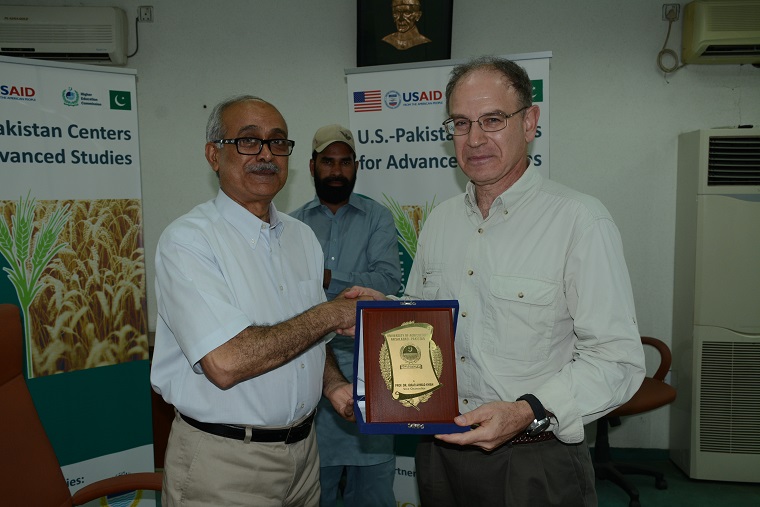 USAID Provincial Director, Punjab, Dr. Miles Toder and Maggie Schoch, Deputy Mission Director for Punjab, Pakistan visited U.S.-Pakistan Center for Advanced Studies in Agriculture and Food Security at University of Agriculture Faisalabad (UAF) and met with UAF Vice Chancellor Prof. Dr. Iqrar Ahmad, the Chief of Party Dr. Bashir Ahmad and USPCAS-AFS team. The Vice Chancellor, UAF, Prof. Dr. Iqrar Ahmad chaired the meeting and gave a warm welcome to USAID representatives. Dr. Miles Toder is a Foreign Service officer with extensive experience working in democracy and governance area, having served in Africa, the Middle East, Europe and South and Southeast Asia. The Vice Chancellor, UAF presented a brief introduction of the University and U.S.-Pakistan Center for Advanced Studies in Agriculture and Food Security. Prof. Iqrar apprised the guests on the history of UAF and the developmental legacy carried out in bringing up the heritage to a current success case. He expressed gratitude to USAID for their continuous efforts in supporting the improvement of higher education and research culture and providing financial assistance to the students in terms of scholarships, scholars exchange program and research grants. Prof. Iqrar said, "UAF is one of the university in Pakistan which strives for the gender equality and provide resources which improves female enrollments in the undergraduate and graduate degree programs which is also one of the key objective of USPCAS-AFS". uspcasDr. Miles Toder, Provincial Director, Punjab, USAID appreciated the modern methods of education used by UAF and said that, "USAID looks forward for continuing the relationship of supporting and improving higher education in Pakistan with more technical and research assistance". Dr. Toder and Ms. Schoch also met the program chairs of thematic areas. A detailed discussion was carried out on USPCAS-AFS research areas, which includes; Agriculture Policy, Biotechnology, Climate Change, Outreach and Precision Agriculture. The focus was also made on the significance of commercialization and creating patents out of research outcomes for the actual contribution to the socio-economic development of Pakistan. The U.S.-Pakistan Centers for Advanced Studies in Agriculture and Food Security (USPCAS-AFS) aspires to ensure food security through outstanding achievements in learning, discovery, innovation and community service with a clear focus on programs of significance to agricultural and rural development. The Center will be assisted in its efforts through collaboration between the University of Agriculture, Faisalabad and the University of California, Davis as the U.S. partner University. Collaboration between the partner USPCAS Universities and the Higher Education Commission will help ensure institutionalization and sustainability of USPCAS-AFS beyond the five-year life. The center mainly focuses upon efficient governance and leadership, effective curricular reforms, high quality applied and policy research, internationally competitive multidisciplinary graduate training and technical and financial sustainability. The project is funded by USAID and is another step forward in strengthening the education and research sector in Pakistan for its Socio-economic development. The delegation visited the post-harvest lab, Food Technology Institute, Rosa Lab and Citrus Green Houses, UAF