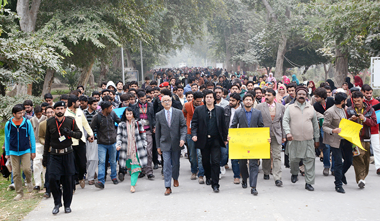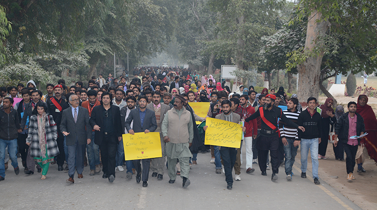 A large number of University of Agriculture Faisalabad’s students and staff on Thursday took out a rally to condemn the merciless massacre of schoolchildren. They showed their commitment to wipe out terrorism and expressed solidarity with the grieved families. University of Agriculture Faisalabad’s students and staff take out a rally to condemn the merciless massacre in Peshawar. University of Agriculture Faisalabad’s students and staff take out a rally to condemn the merciless massacre in Peshawar. The rally was led by UAF Vice Chancellor Prof Dr Iqrar Ahmad Khan and renowned singer Jawad Ahmad. They also showed the commitment to stand with the Pakistan Army and Government at the time when the country was running through the tough time. Addressing on the occasion, UAF Vice Chancellor said that the attack is worst example of terrorism. It speaks the manifestation of most barbaric face of insurgency which is playing havoc with the lives of innocent people. He said that entire nation is united to root out terrorism and one day we will be able to bring the peace back to the country. He said that Islam gives us a message of peace, brotherhood and tolerance; and to read. He Jawad Ahmad said that county will become a peaceful and developed country in which no space is for the terrorists. He also stressed upon the need to deal with the terrorism with iron hands. Senior Tutor Dr Aslam Pervez said that it was the worst ever terrorism. The rally started from Administration Block and culminated at zero point.