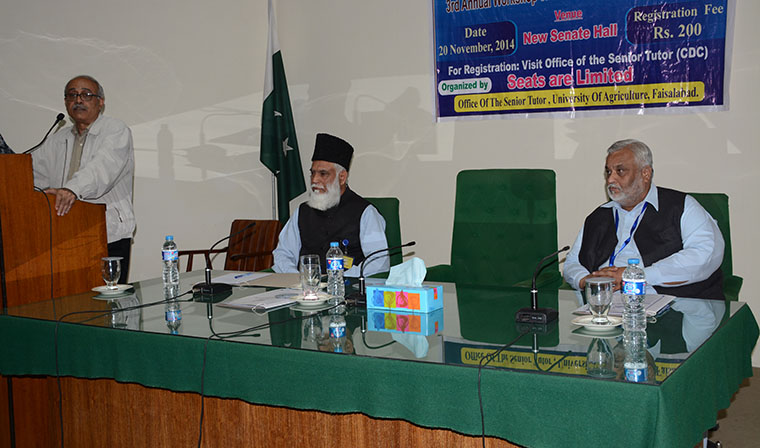 Pakistan is under the grip of different challenges including food insecurity, climate changes and low agricultural productivity. The tangible researches will pave the way for development in order to address the issues. This was stated by University of Agriculture Faisalabad Vice Chancellor Prof Dr Iqrar Ahmad Khan while chairing third annual workshop titled scientific writing and plagiarism arranged by Senior Tutor Office. He urged the scientists to boost up their efforts in the form of tangible researchers for solving the problems of farming community, industries and common man. He said that honesty, integrity and solutions to the problems of stakeholders must be ensured in the research work. He said that the UAF was making all-out efforts to create the competent atmosphere for the researchers so that they can give the shape to ideas. He said that the UAF research portfolio of has jacked up Rs 2 billion including Rs 700 million international funding. He said that the strict measures were being taken to control the plagiarism. He condemned the malpractices being made on the part of scientists. Senior Tutor Prof Dr Aslam Pervez said that the country was blessed with the tremendous talents as there is the need to explore it. He said that senior tutor is taking all measures to polish the God-given skills of students. He said that Principal Officer Student Affairs Prof Dr Muhammad Younas said that the good researches and teachers change the destiny of the nation. He urged the scientists to excel in scientific knowledge and techniques. QEC Director Prof Dr Ahrar Ahmad said that UAF research citations had increased manifold. He said that the quality researches are essential to compete with the rest of the world.