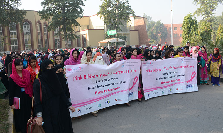 Pakistan has the highest rate of breast cancer in Asia and the number of such patients is increasing as it kills nearly 40,000 women every year in the country. It was stated by speakers at the awareness seminar and walk on breast cancer arranged by Institute of Rural Home Economics in collaboration with Pink Ribbon Pakistan as part of drive aimed at fighting the diseases in which tens of girls students and women faculty members participated. Addressing on the occasion, Institute Director Dr Naheed Abbas said that situation of breast cancer is alarming, demanding awareness among the people to fight the increasing fatal disease. She urged the women to make the proper check-up for prevention and the early treatment of the disease. She said literacy, education and information can play a vital role in decreasing its spread. She suggested making disease as the part of curriculum. She said that women’s hesitance to discuss the disease is one of cause for the high number of breast cancer patients in the country. Dr Humaira Arshad, Assistant Professor, Punjab Medical College said we need to educate women about self-examination and the need to see a doctors if they feel a breast lump. She said if cancer was detected at early stages, chances of survival increases manifold so people should be given awareness for early detection of the cancer. Lecturer Binish Asad said that young women are more frequently reporting with the cancer in Pakistan. The cancer is becoming the leading cause of cancer deaths among women. Lecturer Hina Iftikhar said that the activities are meant to raise the awareness among the women.